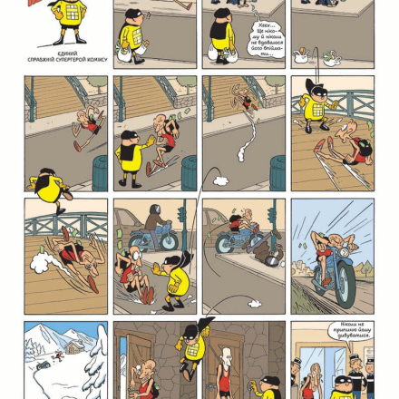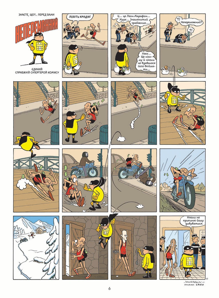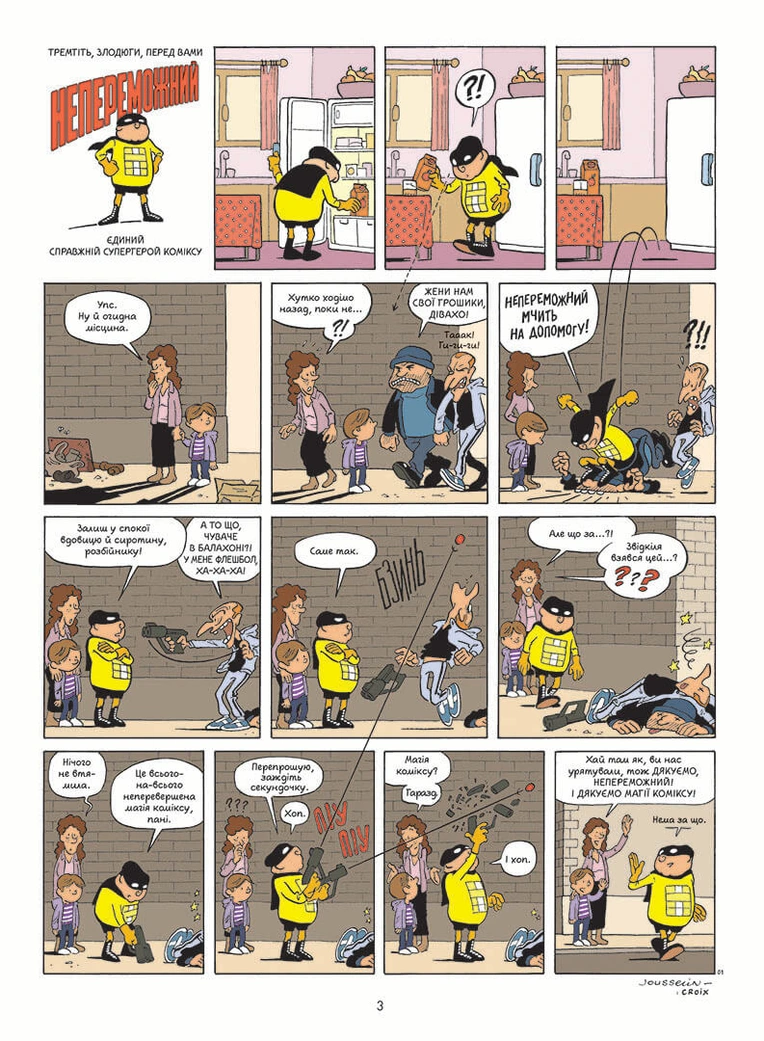 Паскаль Жусселен превратил сетчатую структуру страниц комикса в поле для нарративных экспериментов, в игровое пространство, где персонажи обладают полной свободой передвижения. Его супергерой перепрыгивает с одной клетки на другую, играет со смещениями кадров и переходами между страницами.