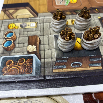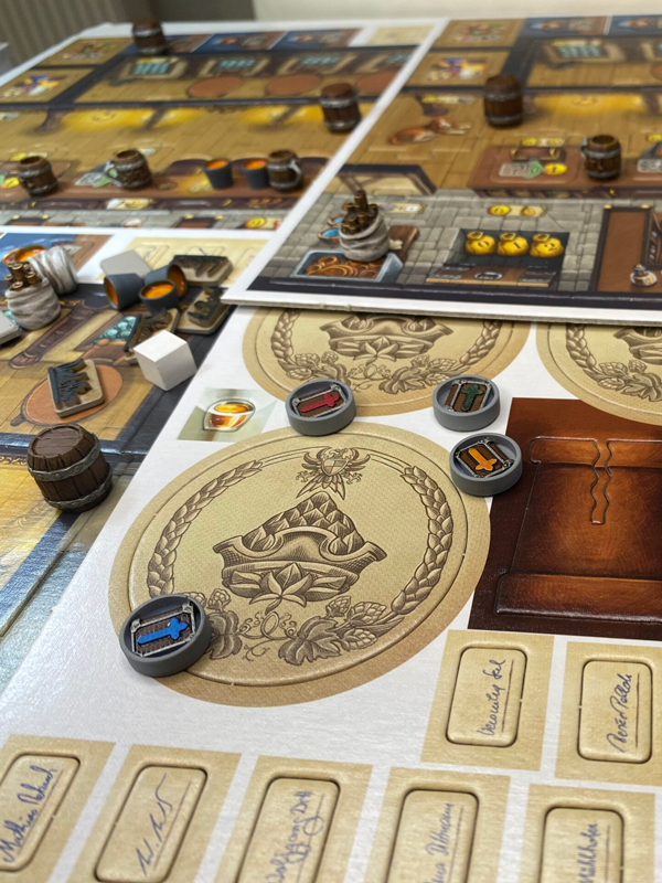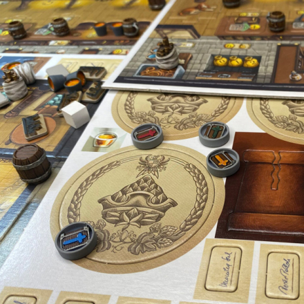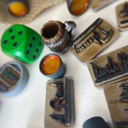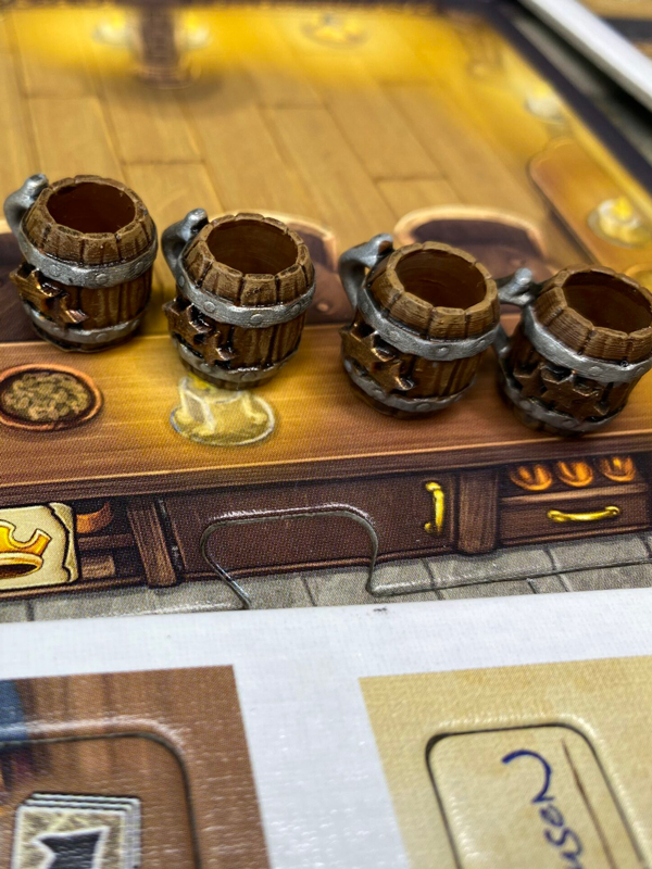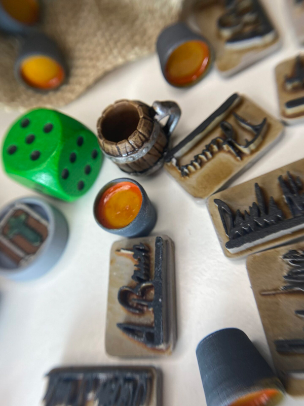 Комплектация: 76 премиальных фишек: 4 бочки (18х15 мм), 4 мешочка с талерами (20х15 мм), 4 маркера монастыря по цветам игроков (6х16 мм), 4 кружки (13х17 мм), 20 фишек шнапса (8х10 мм), 40 фишек подписей (+4 дополнительные запасные фишки)(5х20 мм) и мешочки для хранения фишек