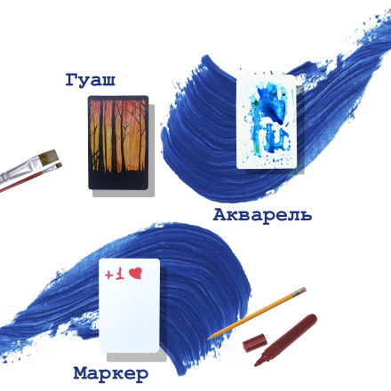Рисунок на белые карточки можно нанести лайнером, маркером, шариковой ручкой, простым карандашом, восковыми мелками, гуашью и акрилом.