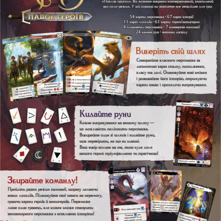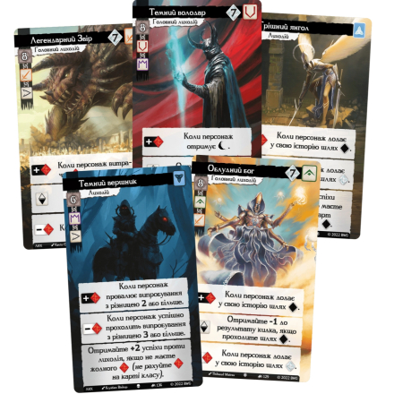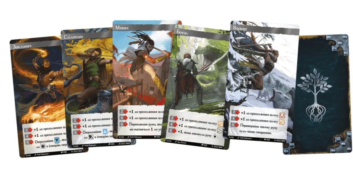 - применить эффекты карты персонажа. Эффекты карт наследия применяют, когда выпадает руна «героя / антигероя» при прохождении испытания. Эффекты карт происхождения приносят жетоны опыта. Карты класса обладают постоянными эффектами, если выложить на них нужное количество жетонов опыта.
