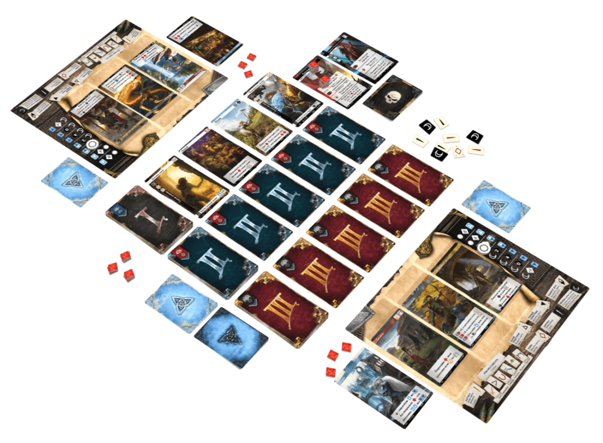 - Испытание. При прохождении испытания игрок смотрит на базовую сложность испытания и выбирает путь (верхний или нижний, который повышает сложность испытания на 1). Затем игрок берет доступные руны: три основные руны + изображенные на карте испытания руны умений, если у него есть соответствующие символы в истории персонажа. Бросив руны, игрок применяет эффекты и определяет результат, суммируя выпавшие успехи на рунах и бонусы от эффектов карт. Если полученный результат больше или равен сложности испытания, игрок успешно проходит испытание и размещает карту испытания под картой персонажа соответствующего акта на своем планшете.