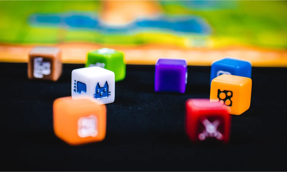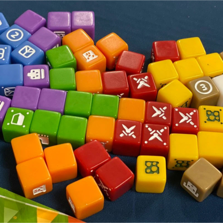 - Монеты и кредиты. Можно купить максимум два кубика разных цветов, потратив выпавшие монеты и кредиты. Купленные кубики кладутся в зону сброса.
