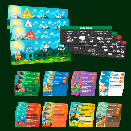 Каждый игрок перемещает из зоны запаса на планшете в зону бросков над планшетом столько кубиков, какой лимит его кубиков. Начальный лимит – 9 кубиков. Он навсегда увеличивается на 1 за каждый полученный жетон руки. Также игрок берет по 1 кубику за каждую красную линию на трассе между фишкой его бегуна и фишкой лидера. Если в зоне запаса закончились кубики, игрок перемещает в нее все свои кубики из сброса.