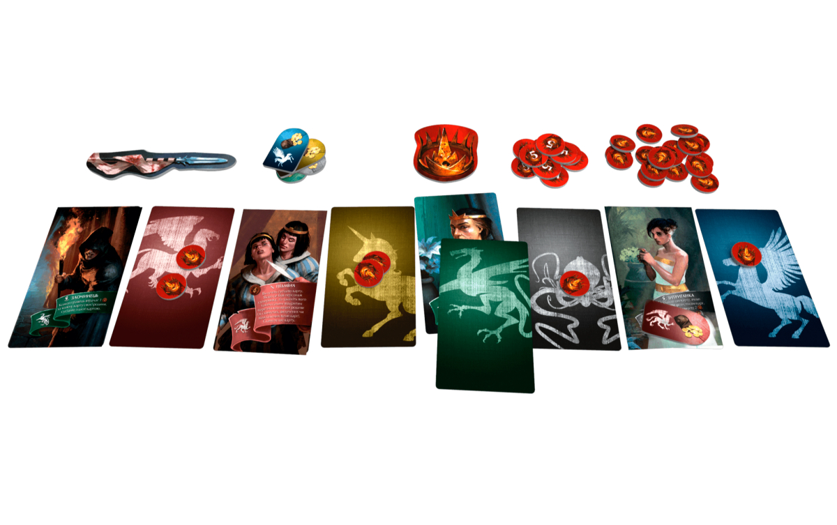 - Близнец. Перед началом игры откладывается в сторону. Добавляется в ряд только с помощью «Принца». Приносит 1 очко влияния. Когда удаляется, также нужно сбросить карту «Принца».