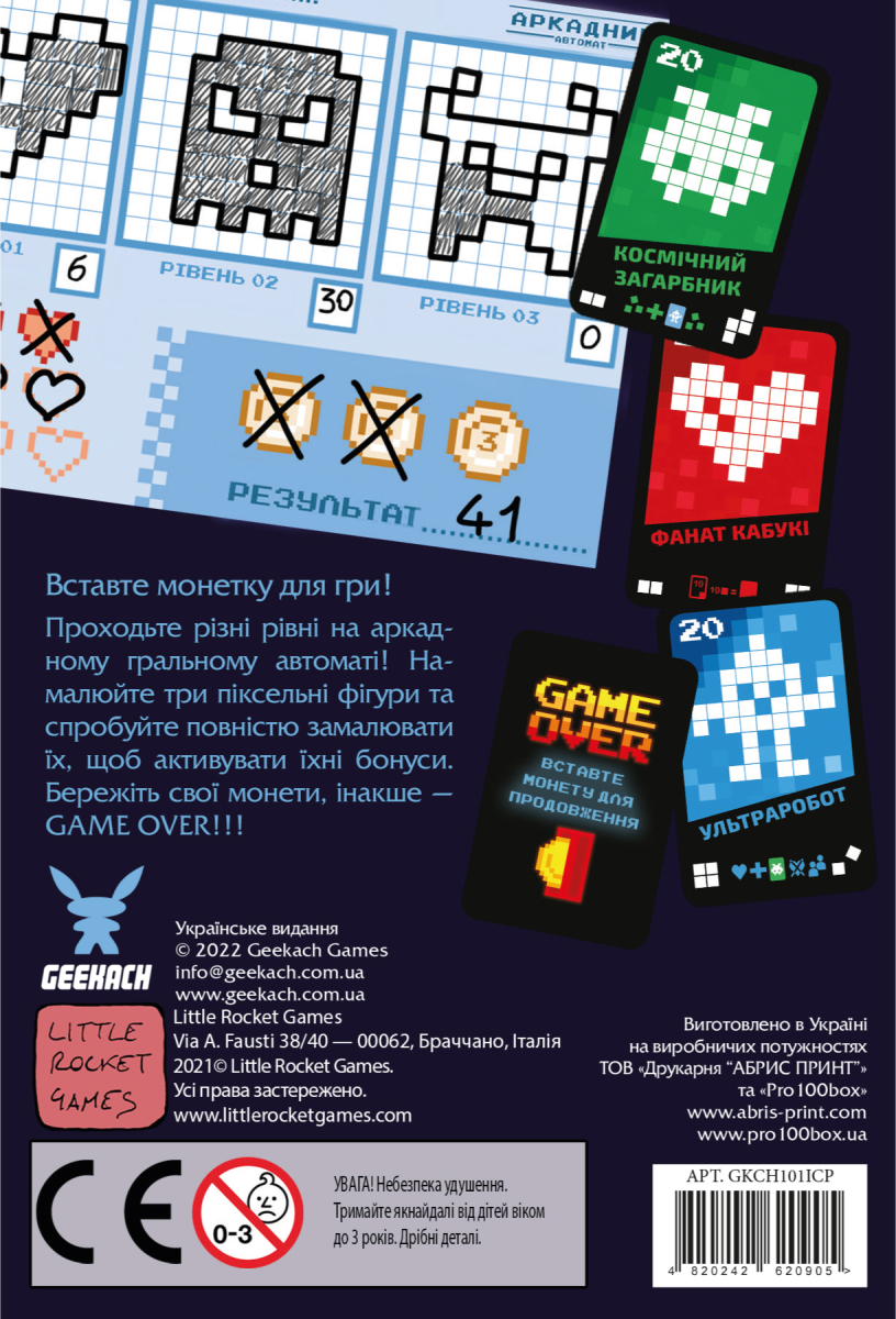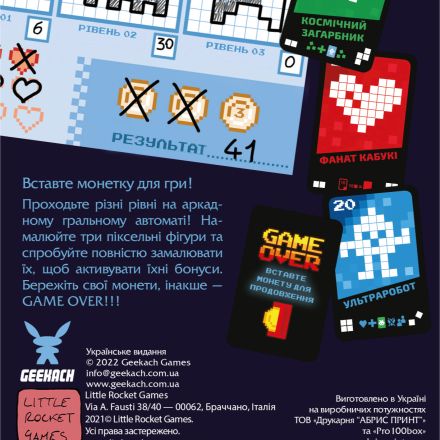 Проходите разные уровни игры на аркадном игровом автомате! Нарисуйте три пиксельных фигуры и попытайтесь полностью зарисовать их, чтобы активировать бонусы. Выбирайте разные фигуры и создавайте интересные комбинации. Открывайте карты, выбирайте одну из двух деталей и рисуйте ее в пределах одной из ваших фигур. Берегите свои монеты, иначе – GAME OVER!!!