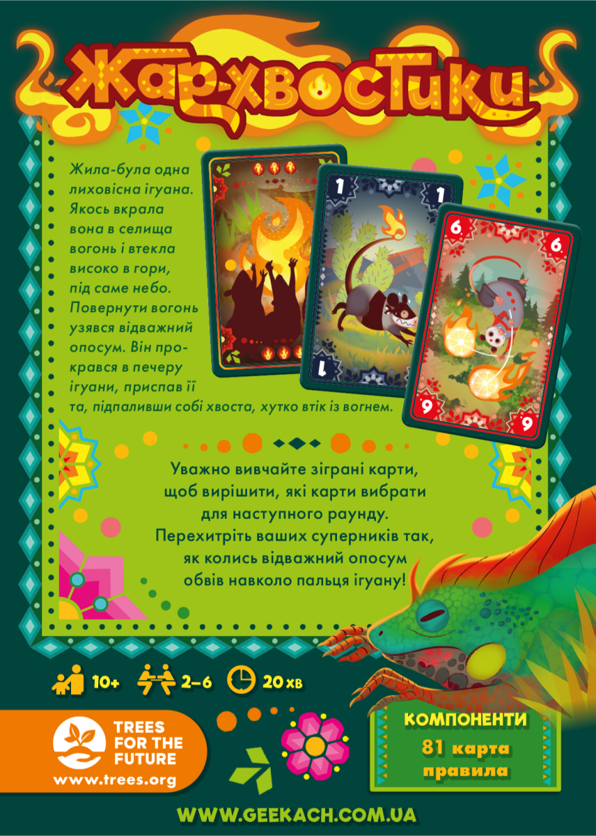 Когда-то давно зловещая игуана похитила огонь, и убежала с ним высоко в горы, под самое небо... и только храбрый опоссум вызвался вернуть похищенное, забежал в пещеру игуаны, поджег хвост и скорее побежал в свое логово! «Жар-хвостики» - это основанная на старой сказке быстрая карточная игра со ставками, в которой вы будете пытаться принести к очагу своей семьи опоссумов как можно больше угольков. Но берегитесь, потому что если не будете осторожны, соперники могут похитить уже добытое.