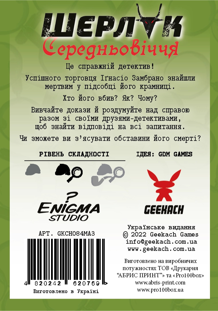 "Sherlock" (также известная как "Элементарно") – популярная серия быстрых детективных кооперативов для 1-8 игроков. В 2019 году эта игра стала номинантом престижного конкурса "Spiel des Jahres" (Игра года в Германии). В каждой коробочке игроков ждет отдельное дело. Это интересный детективный филлер, который можно расследовать соло, с друзьями или членами семьи. Игра понравится как новичкам, так и опытным игрокам.