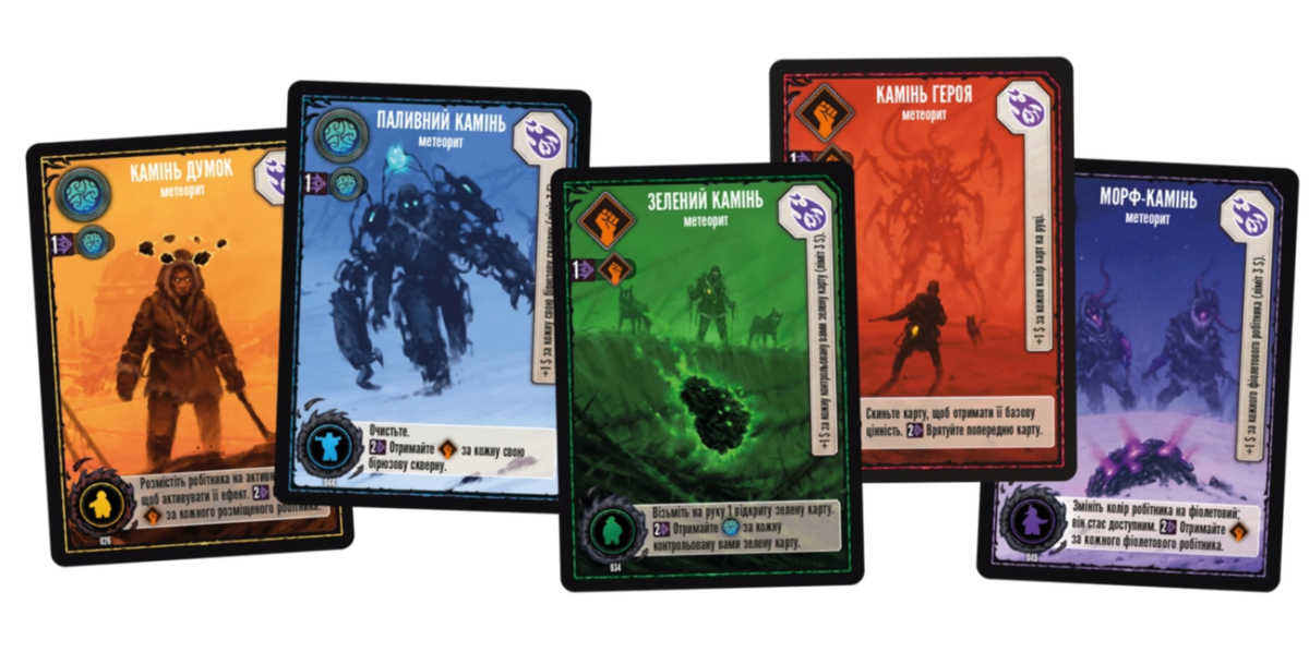 - СБОР. Получите любые видимые выгоды локации с вашим мехом. Выгода «Улучшить» позволяет подложить карту под правый край планшета меха, чтобы активировать постоянное свойство карты до конца игры. Выгода «Сплавить» позволяет подложить карту метеорита под нижний край планшета, чтобы получить бонусы сплава всех подложенных метеоритов. Выгода «Похвалиться» позволяет выложить фишку славы на поле лагеря в категорию, для которой вы выполнили или перевыполнили условие.