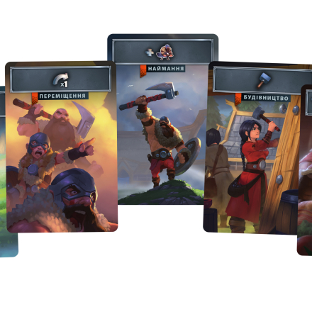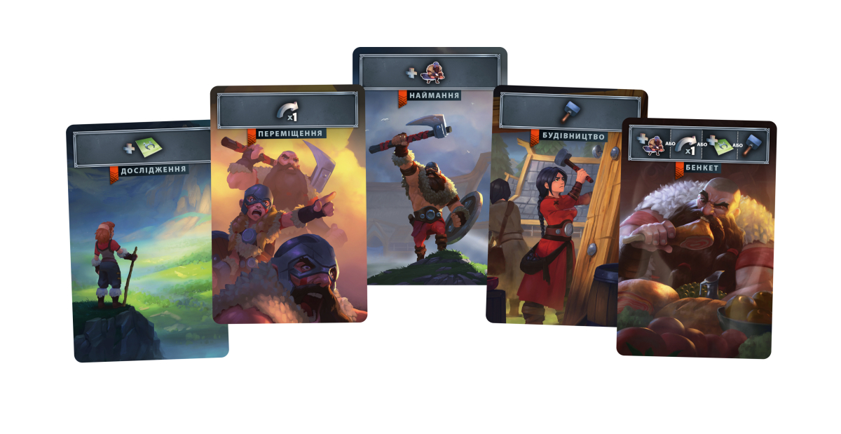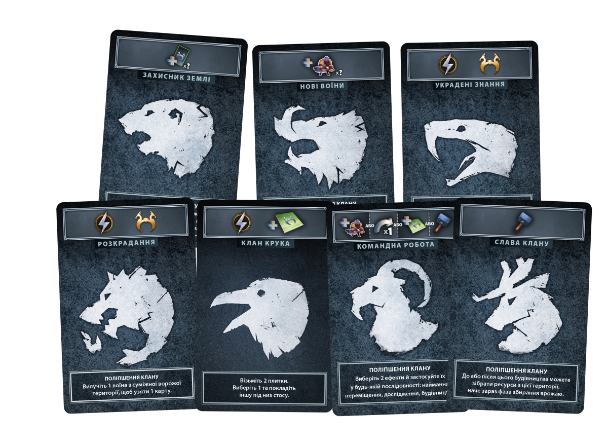 Начальные карты игроков содержат 4 возможных эффекта: наем, исследование, перемещение и строительство. Карта «Пир» - джокер, который позволяет применить любой из 4 эффектов. На картах развития и кланов указаны различные эффекты, позволяющие взять карты или применить особые эффекты.