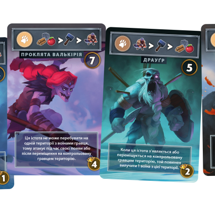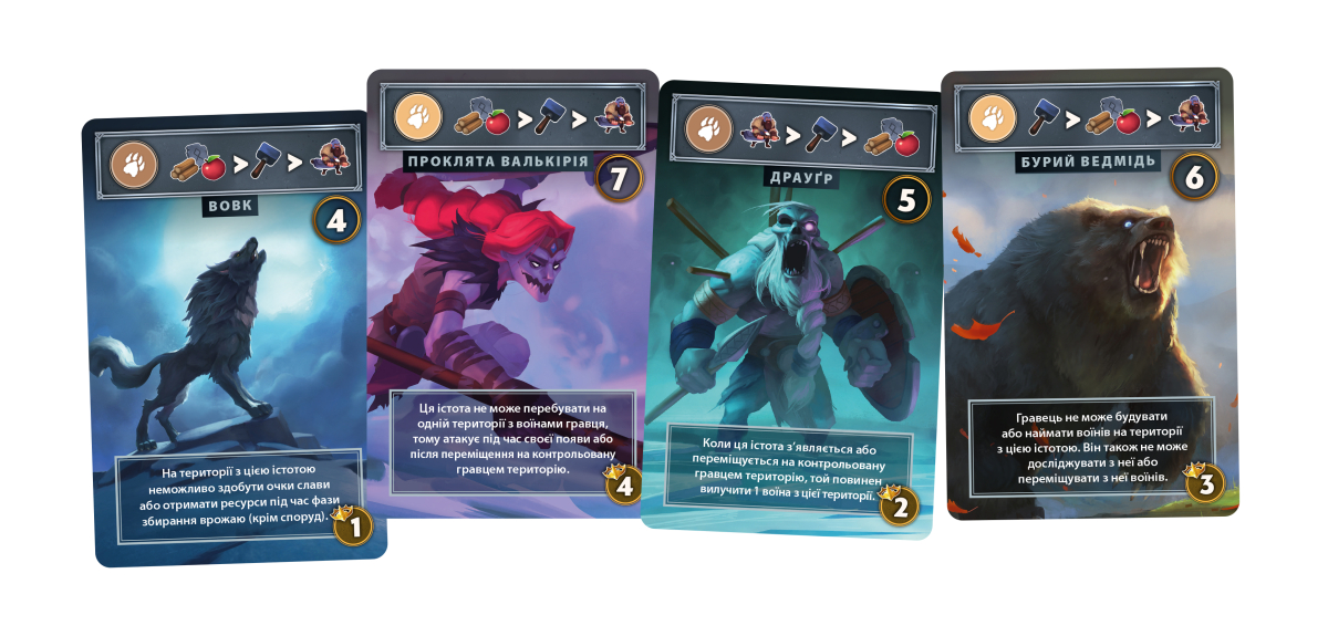 Модуль «Существа» делает игру более вариативной и сложной. Он содержит фигурки волков, бурых медведей, драугров и проклятых валькирий с соответствующими картами. Существа обладают особыми эффектами, описанными на этих картах.