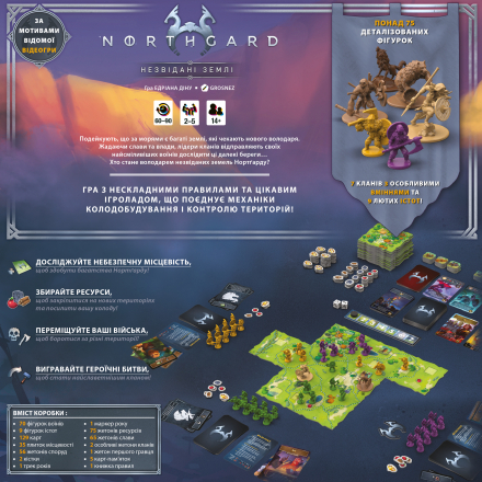 Колодостроительная стратегия с механикой контроля территорий по мотивам знаменитой видеоигры "Northgard". В этой игре, основанной на скандинавской мифологии, игроки управляют кланами викингов, которые отправляются исследовать загадочный континент. Настольная игра "Northgard: Uncharted Lands" вышла в 2022 году. Она получила отличные оценки и отзывы на сайте «BoardGameGeek».