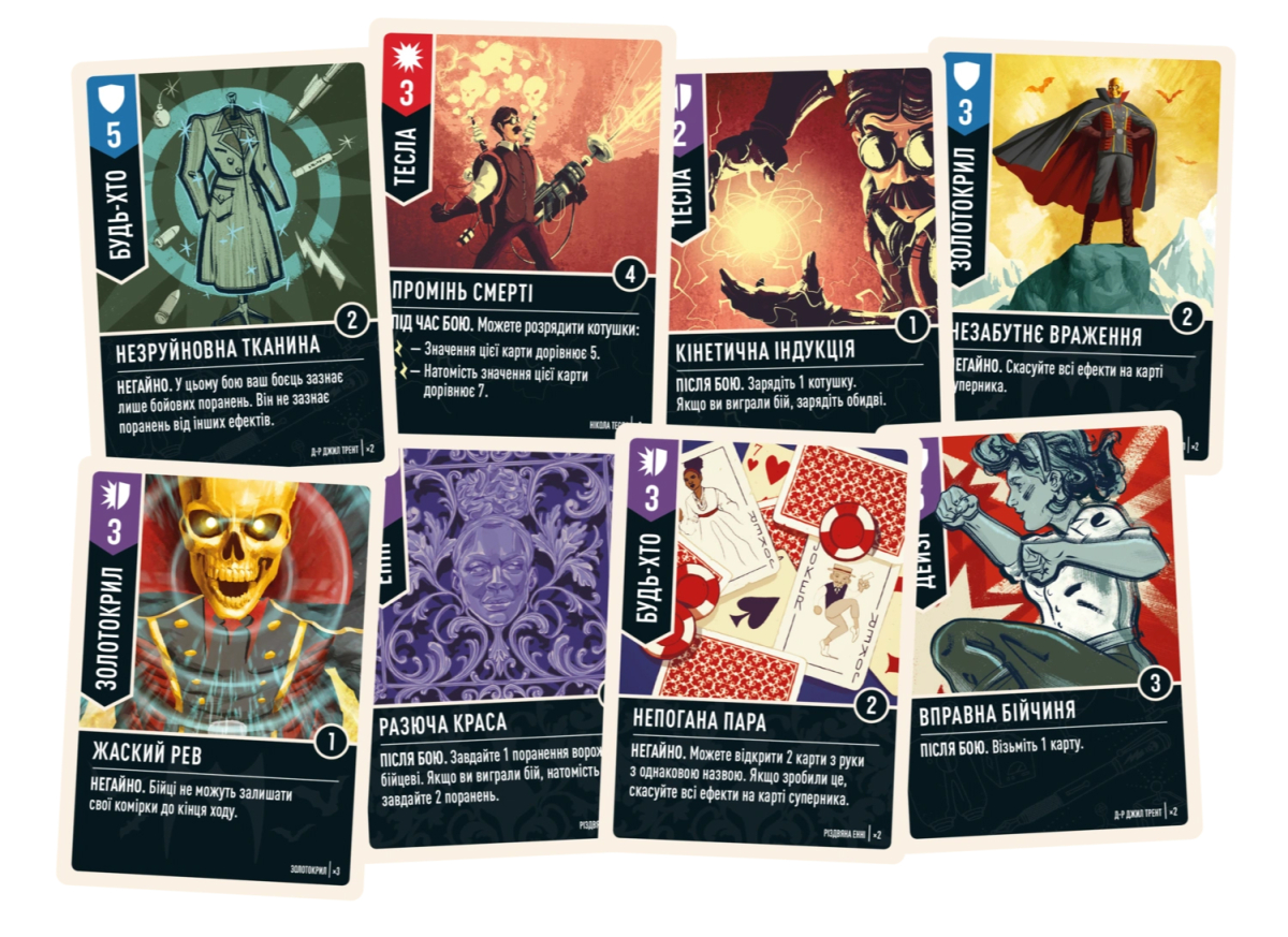 - Золотокрыл, старейший супергерой, бьет сильнее, если не отступает: персонаж получает бонус к атаке, если в этот ход игрок не выбирал действие маневра.