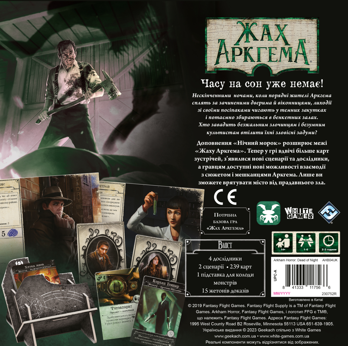 «Arkham Horror (Third Edition): Dead of Night» - дополнение для кооперативной настольной игры «Ужас Аркхэма. Третья редакция». Игрокам предлагается два новых больших сценария («Выстрелы во тьме» и «Безмолвие Цатхоггуа»), которые они смогут пройти четырьмя новыми сыщиками.
