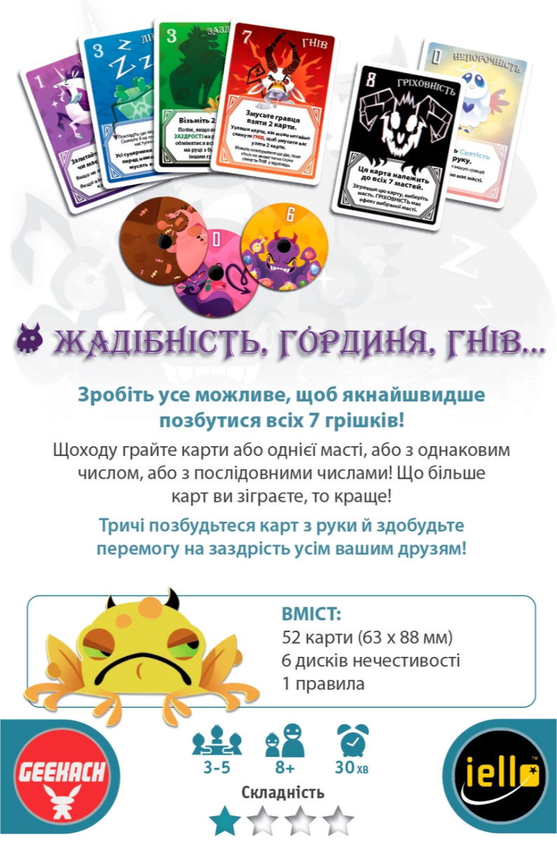 В карточном филлере «The Deadlies» игроки пытаются избавиться от карт грехов на руках. Если какому-то игроку удается освободить свою руку от карт, он уменьшает значение на счетчике-диске нечестивости на 2. Побеждает игрок без карт со значением 0 на диске нечестивости.