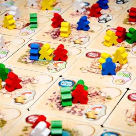 Перед началом партии из 30 тайлов собирается игровое поле Султаната – 5 на 6 клеток. На каждый тайл выставляется три случайных мипла (они вытаскиваются вслепую из мешочка).