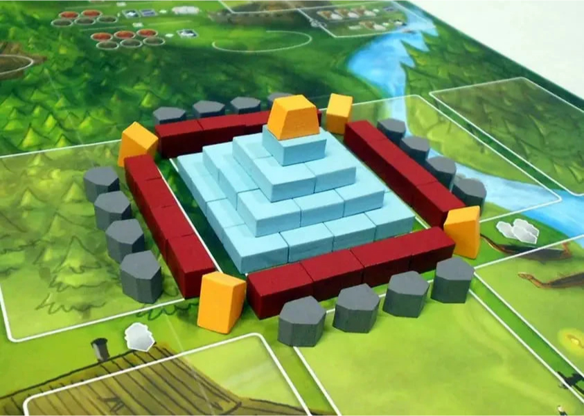 Перед началом партии игроки получают планшеты, рабочих своего цвета и стартовые монеты (первый игрок – 3 серебра, а каждый следующий на 1 больше). Еще нужно подрафтить карты сооружений: участники получают по четыре карты, выбирают по одной, передают карты по кругу, снова выбирают и т.д.