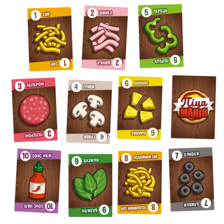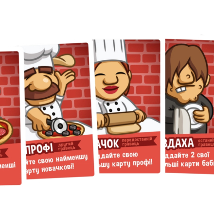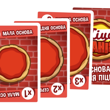 - Колода делится на три типа карт: основы для пиццы, начинка и повара. Карты основы и поваров размещаются в центре стола, а карты начинки раздаются игрокам поровну в руки.
