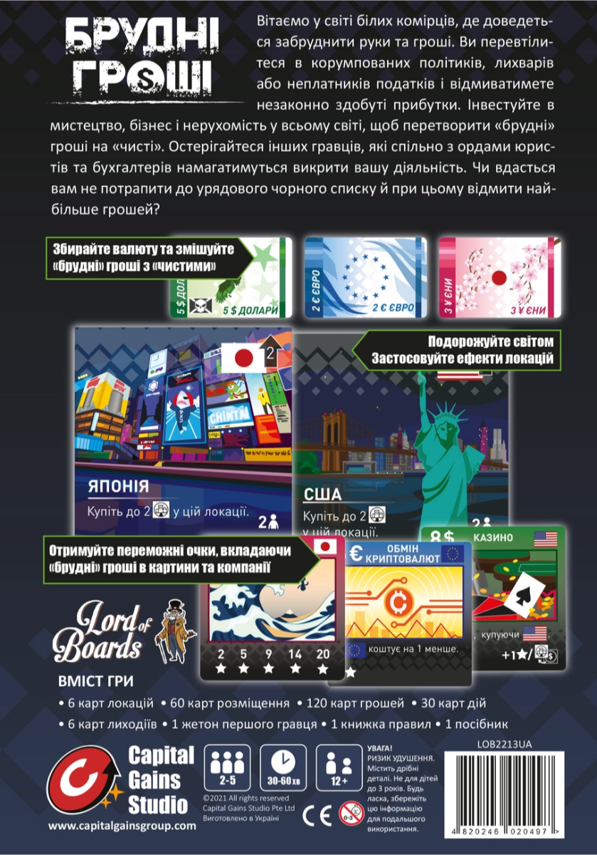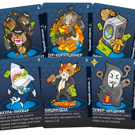 - Во время своего хода игрок выбирает локацию и получает все карты действий и денег. Сразу разыгрываются все карты действий в произвольном порядке. Лимит денег в руке – 7 единиц, весь остаток переходит в черный список и принесет штрафные очки в конце игры. Среди карт действий могут выпасть «Проверка» или «Аудит» – контроль соперников на наличие у них «грязных денег», за которые они получают карты черного списка.