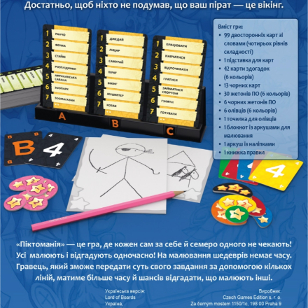 В «Пиктомании» участники одновременно рисуют задания и отгадывают, что рисуют соперники. Перед началом игры они получают листы, карандаши, жетоны звезд и карты догадок выбранных цветов.
