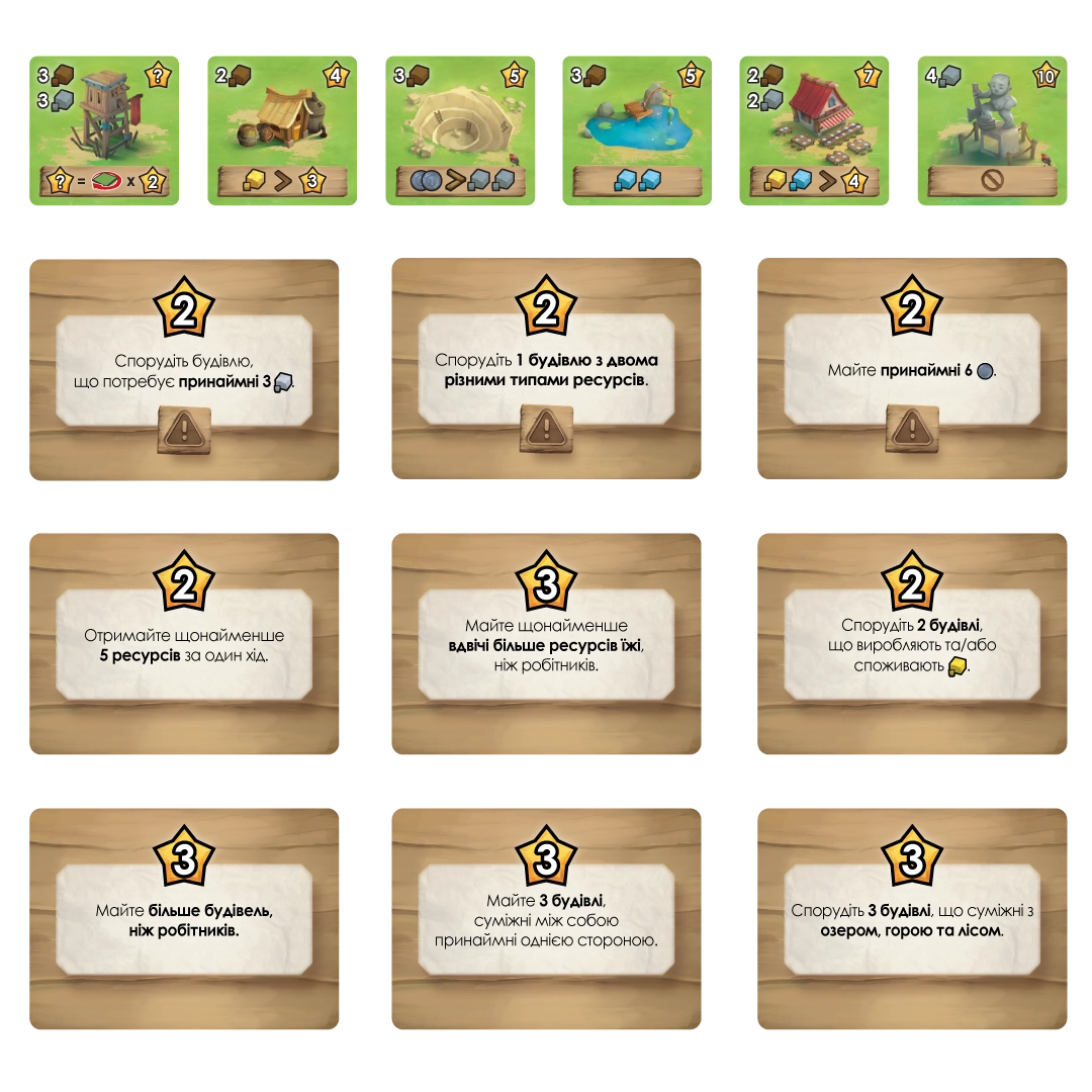 - В свой ход игрок может отправить своего мипла в зону строительной площадки, рынка или в город. За построенные объекты нужно расплачиваться ресурсами. Дерево, камень, рыбу и пшеницу можно собрать с помощью фишек рабочих в зоне города. Также существует рынок для обмена монет на ресурсы.
