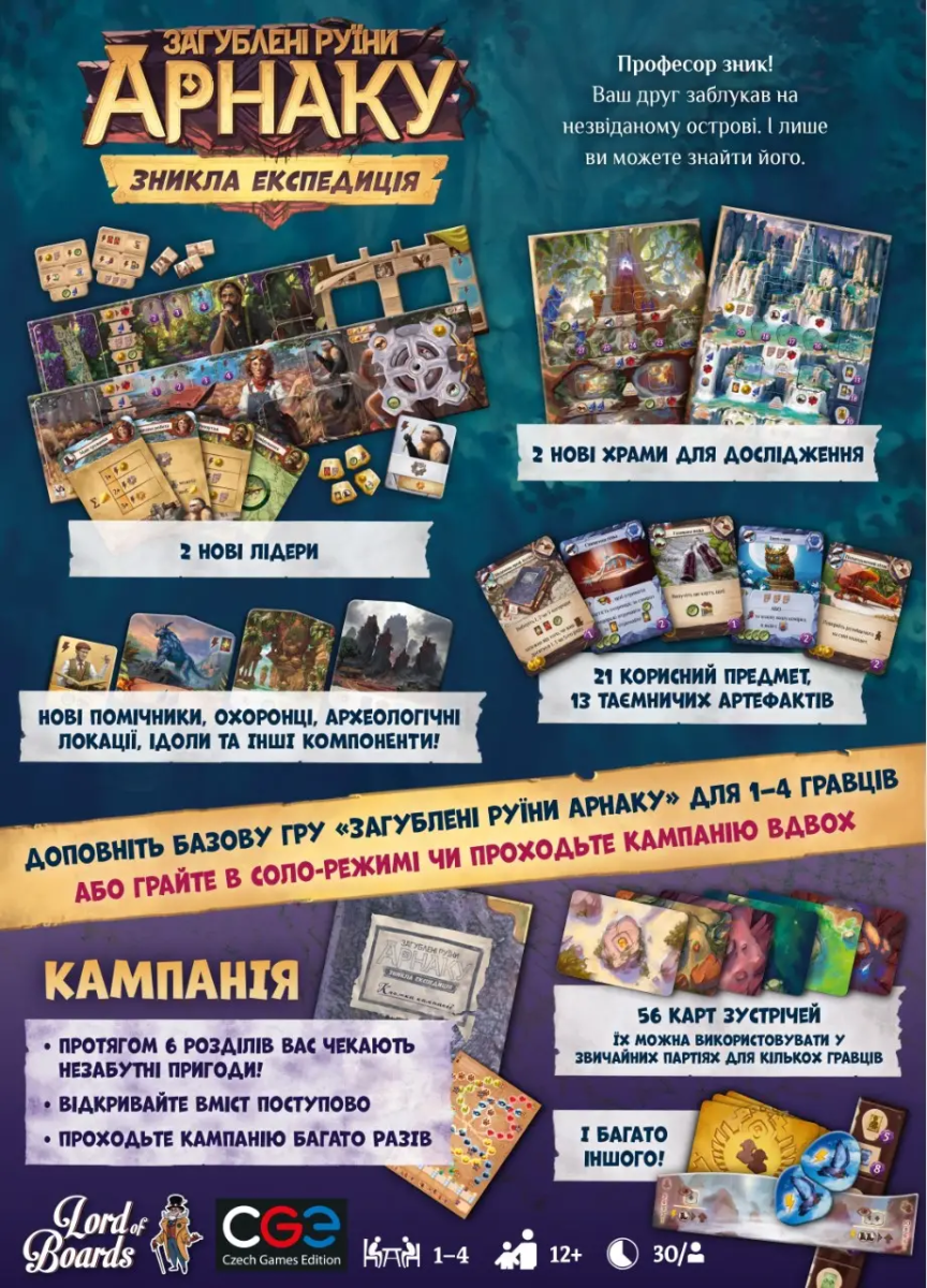 «Затерянные руины Арнака: Пропавшая экспедиция» – это второе после «Лидеров экспедиции» дополнение к колодостроительной игре «Затерянные руины Арнака» с размещением рабочих и сбором сетов из удивительно выполненных объемных жетонов ресурсов. Отправляйтесь в два новых храма, знакомьтесь с механикой и журналистом, находите новых идолов или беритесь за поиск пропавшей экспедиции в соло или кооперативной сюжетной кампании из шести глав, представленной в отдельной книге правил.