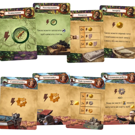 - Новые лидеры - к вашим экспедициям присоединится механика, имеющая обезьянку-помощника и строящий огромный механизм с использованием золотых зубцов, журналист, готовящий материалы для своей газеты, а также золотоискатель и путешественница, к игре с которыми необходимо только заменить карты в стартовой колоды из базовой игры.