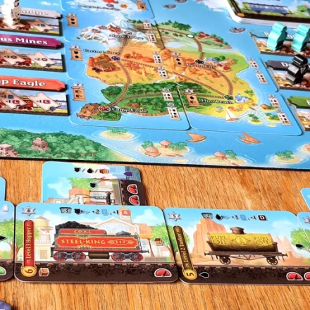 Основная механика – создание эффективного движка для долгосрочной стратегии в рамках партии, где вы можете по-разному использовать карты в руке, назначая их в качестве локомотивов, грузовых или пассажирских вагонов, зданий, груза или как валюту для строительства. В начале игры вокруг поля в виде острова выкладываются жетоны заданий на доставку и рядом с ними названия городов (конечная цель доставки).