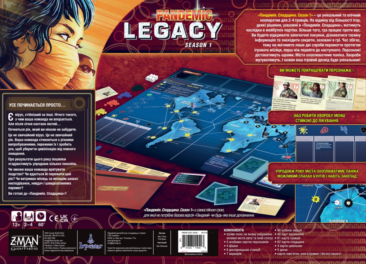 Первый сезон «Pandemic Legacy» предлагает игрокам пройти большую сюжетную кампанию. Двенадцать месяцев врачи, ученые, исследователи, диспетчеры и простые эрудиты будут носиться по свету, предотвращать распространение вирусов, строить исследовательские станции, изобретать лекарства от болезней и заниматься кучей других дел, о которых Гикач умолчит, чтобы никому не испортить впечатление.
