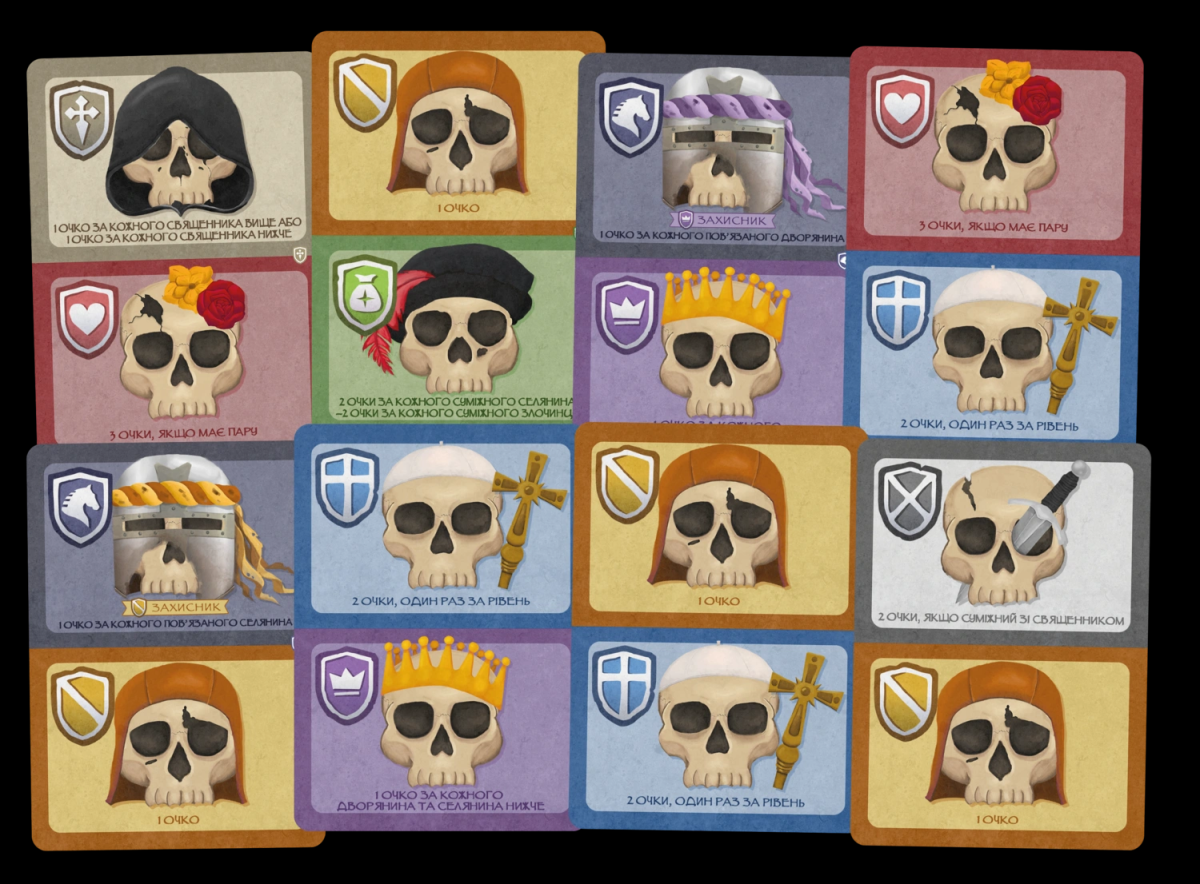 Игра содержит 36 карт (18 из базовой игры и 18 из дополнений), на каждой из которых изображено по 2 черепа, это может быть: защитники, купцы, фанатики, дворяне, крестьяне, священники, любовники и/или преступники. В течение игры игроки выкладывают карты в фигуру формы пирамиды. В конце партии они получают очки за определенные смежные черепа в своих пирамидах, согласно последнему желанию умершего.