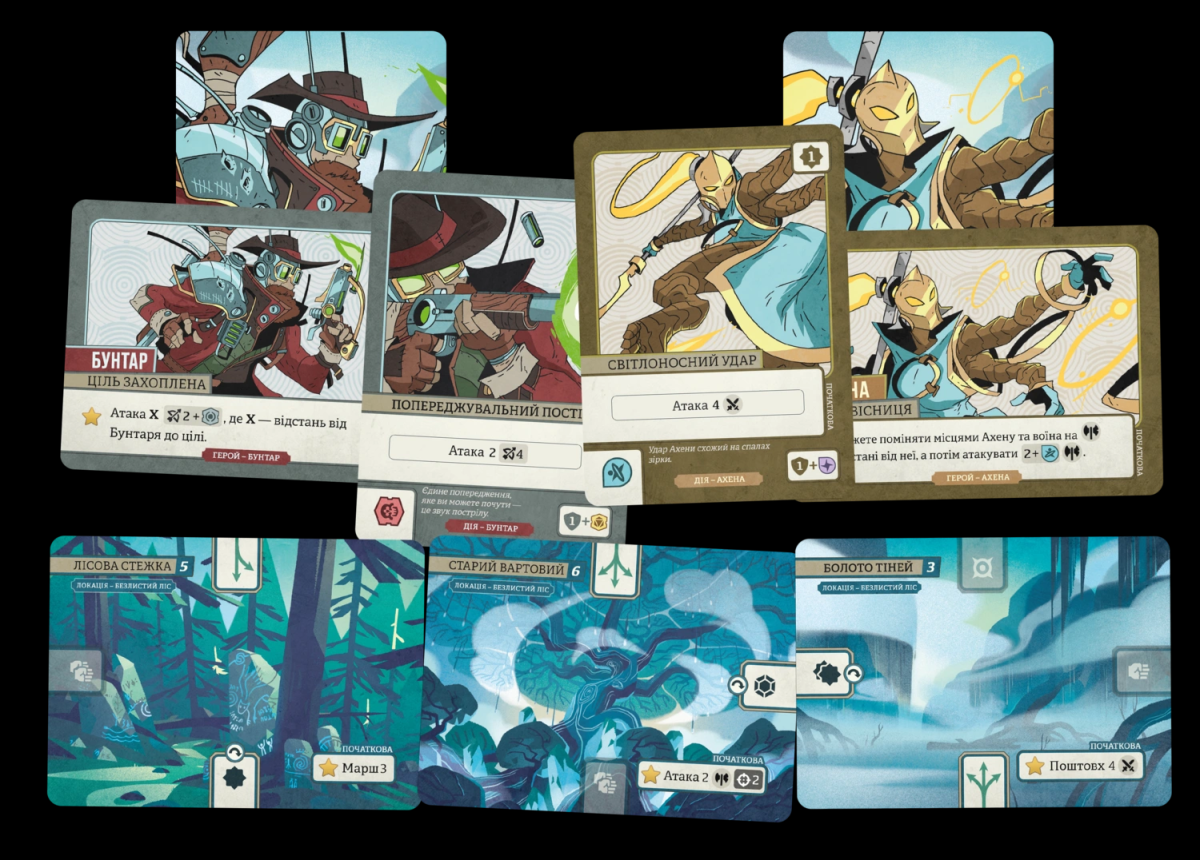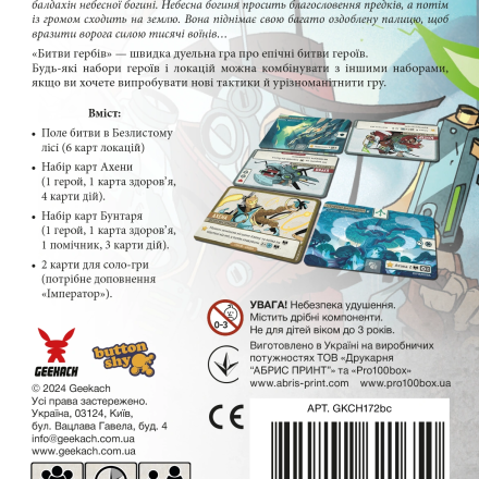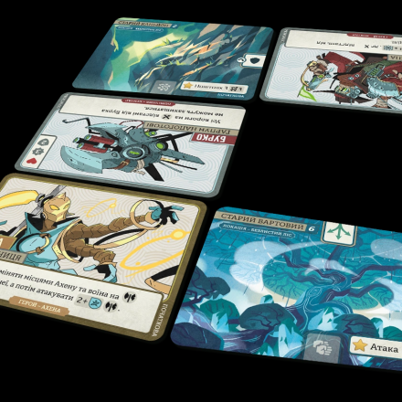 Набор “Битви гербів: Безлистий ліс” открывает серию минималистичных игр в жанре скирмиш, где участникам предстоит бороться за звание величайшего героя. Базовая игра содержит карты персонажей и карты местности. С помощью дополнений вы сможете открыть для себя новых героев.
