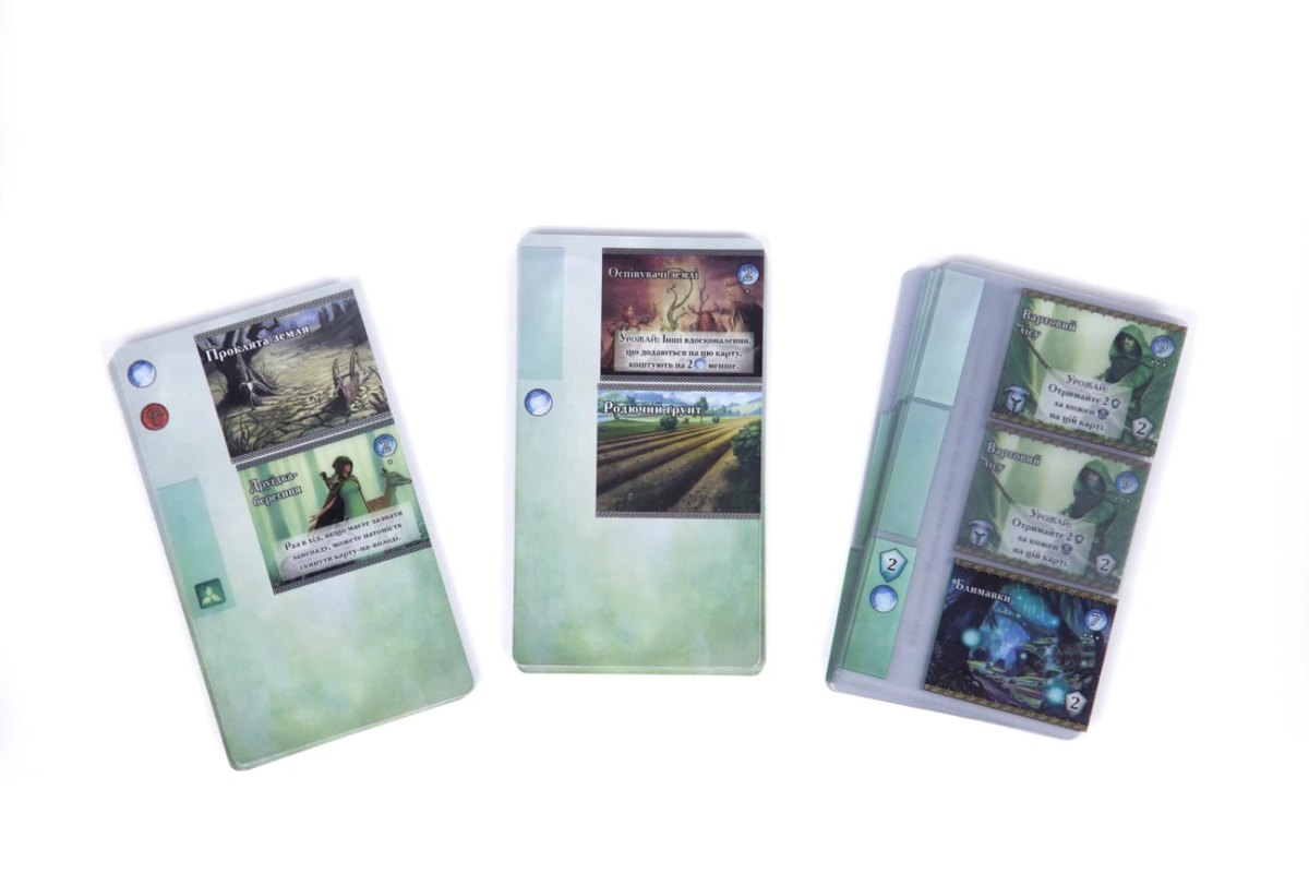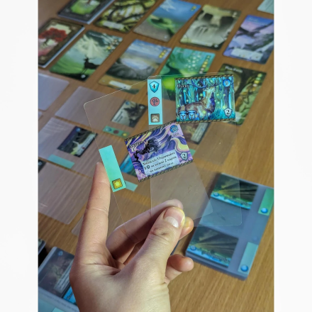 Каждая карта помещается в прозрачный протектор с иллюстрацией, которая закрывает лишь третью часть карты.