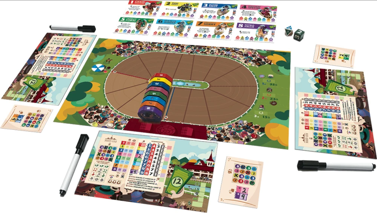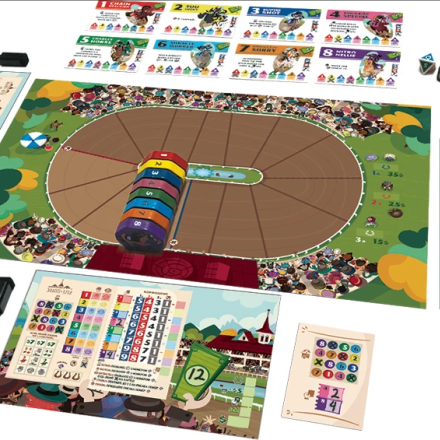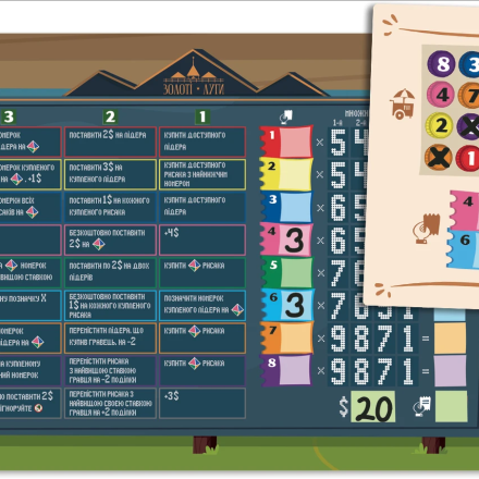 - Раздайте игрокам планшеты и маркеры, а также по одной случайной стартовой карте. Игроки должны зачеркнуть четыре числа с этой карты в зоне торгового лотка на своем планшете, а также отметить две ставки в ячейках указанных на карте лошадей. Также отметьте стартовый капитал в 12 единиц на планшетах.