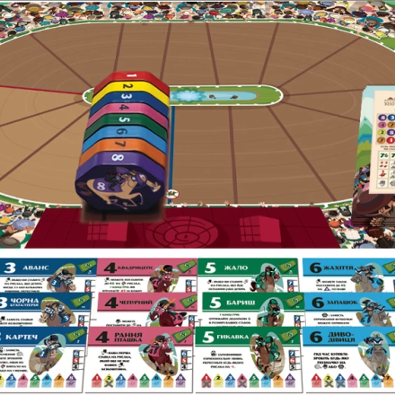 - Для каждого скакуна выберите карту, участвующую в партии. Разместите эти карты у трека, который образует "Рынок". Для первой игры есть отдельный набор, обозначенный символом яблоневого огрызка.