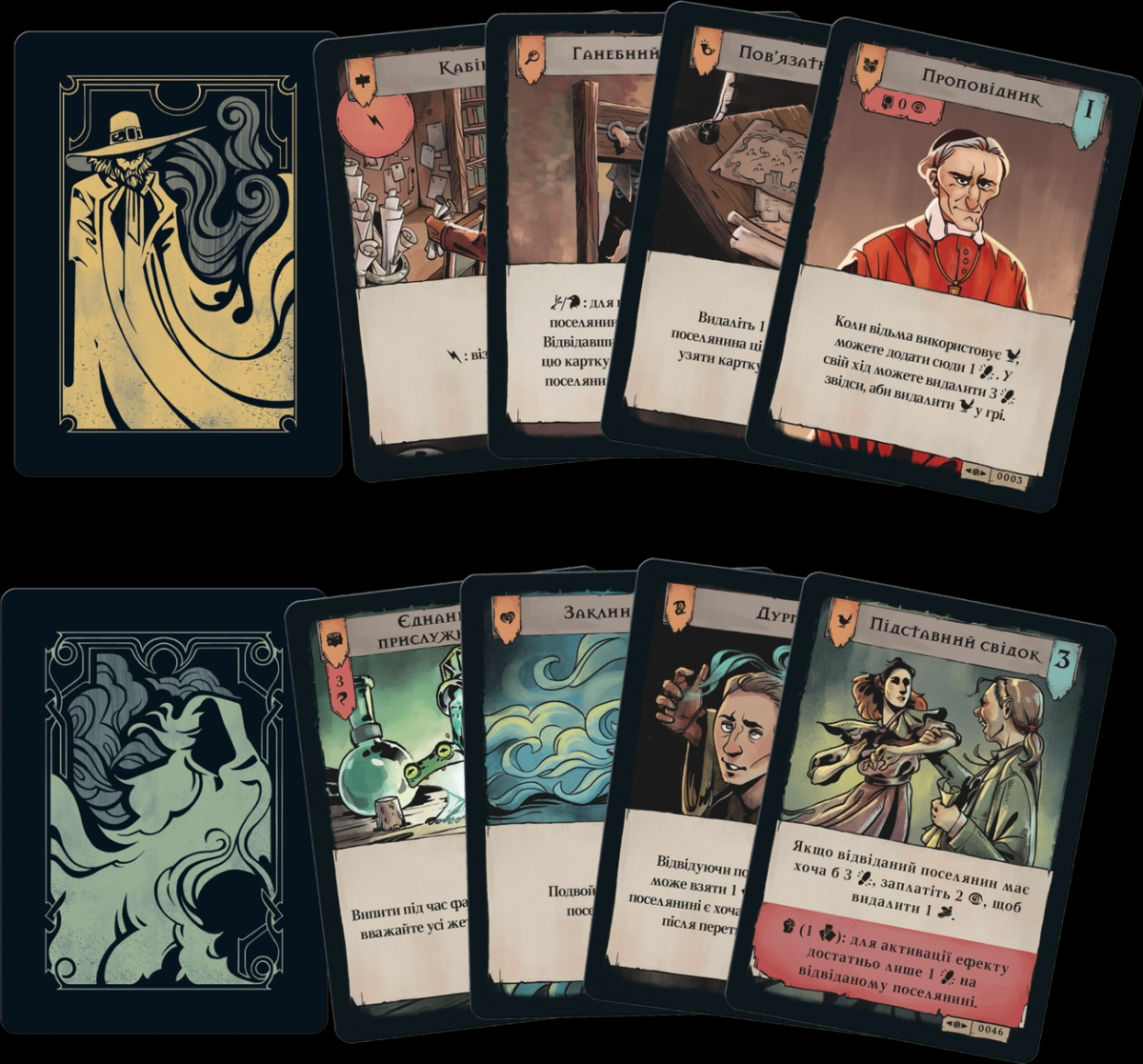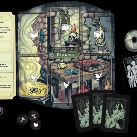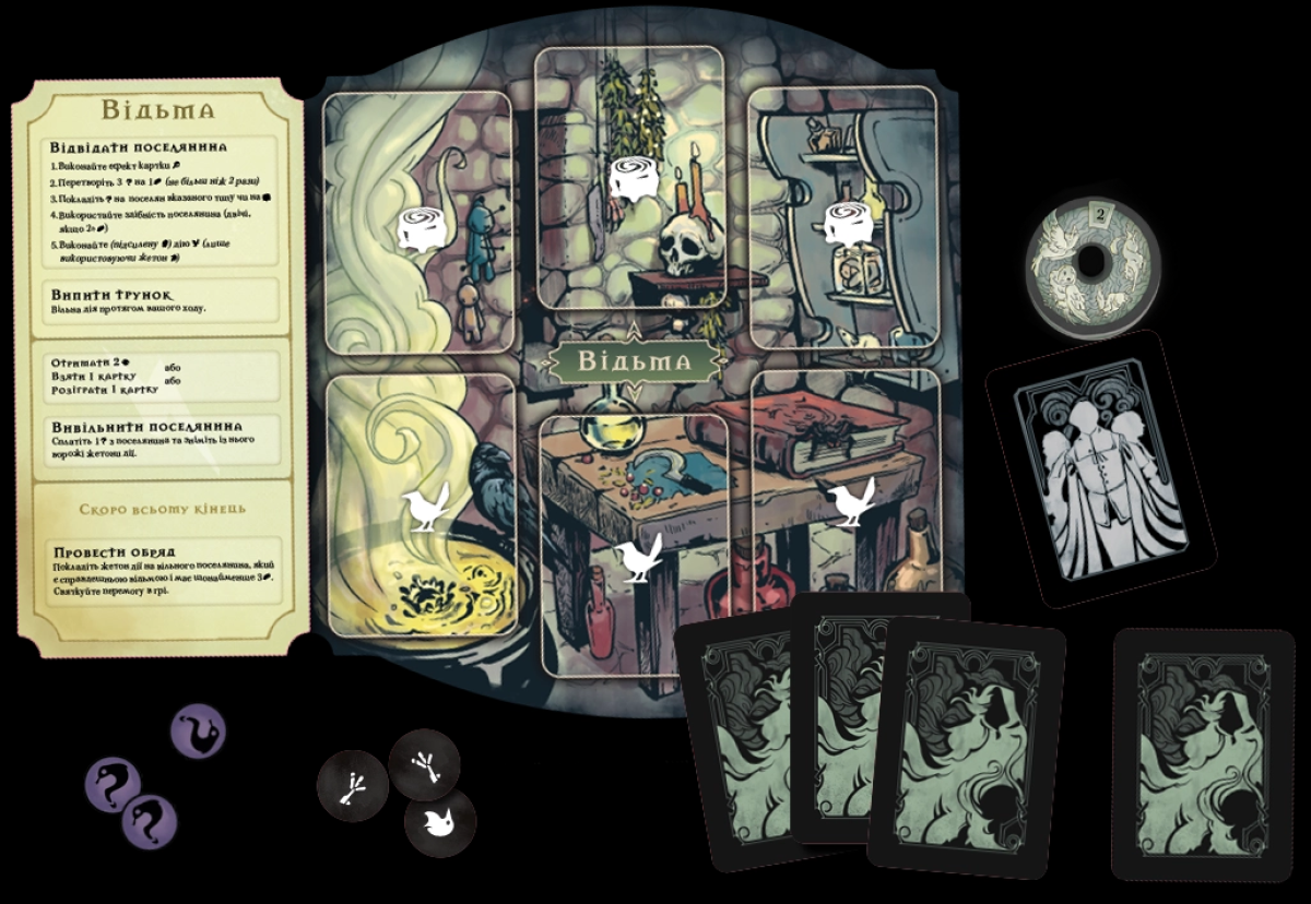 - Действия ведьмы. Выпить зелье; провести обряд (положить жетон действия на карту поселянина, который является настоящей ведьмой и имеет три услуги – это приводит к победе ведьмы).