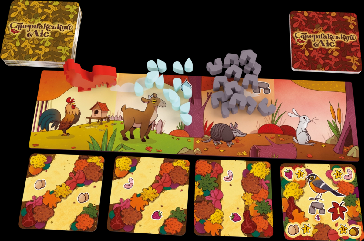 - Под игровым планшетом всегда будут размещаться три случайных карты троп и одна карта животного. У первого игрока есть выбор из всех четырех карт, а следующие выбирают из меньшего количества карт. На карте тропы изображена еда, а на картах животных ценность каждого вида пищи для этого животного, объем запаса пищи и количество победных очков за размещение в лесу. Рынок карт обновляется только в конце раунда.