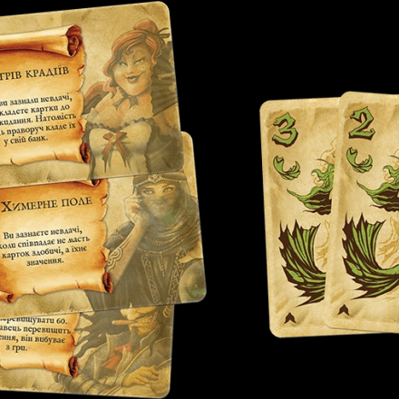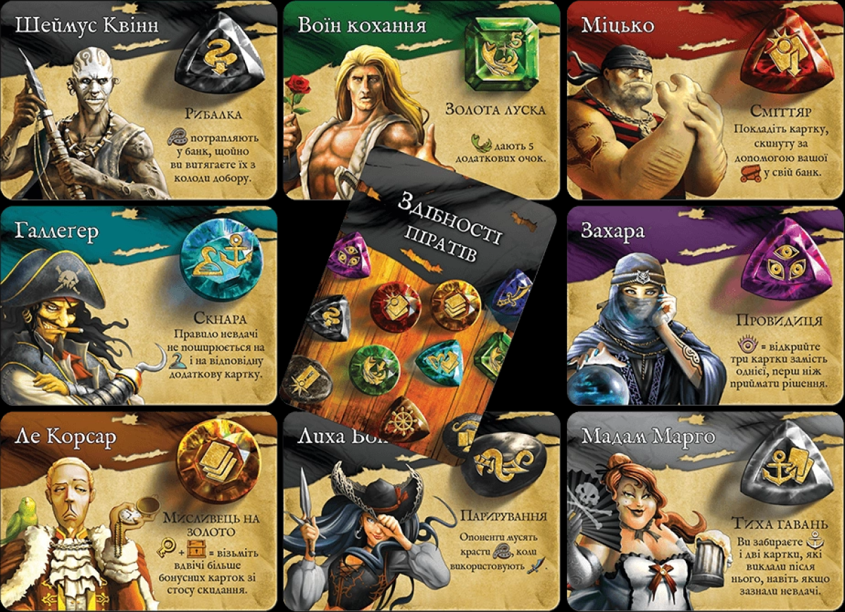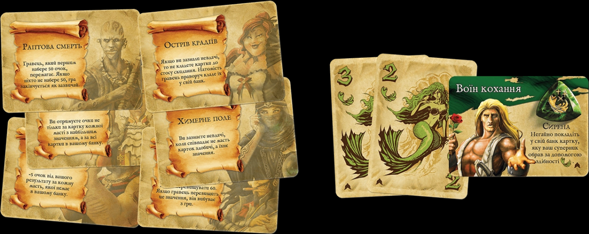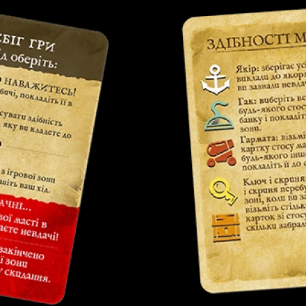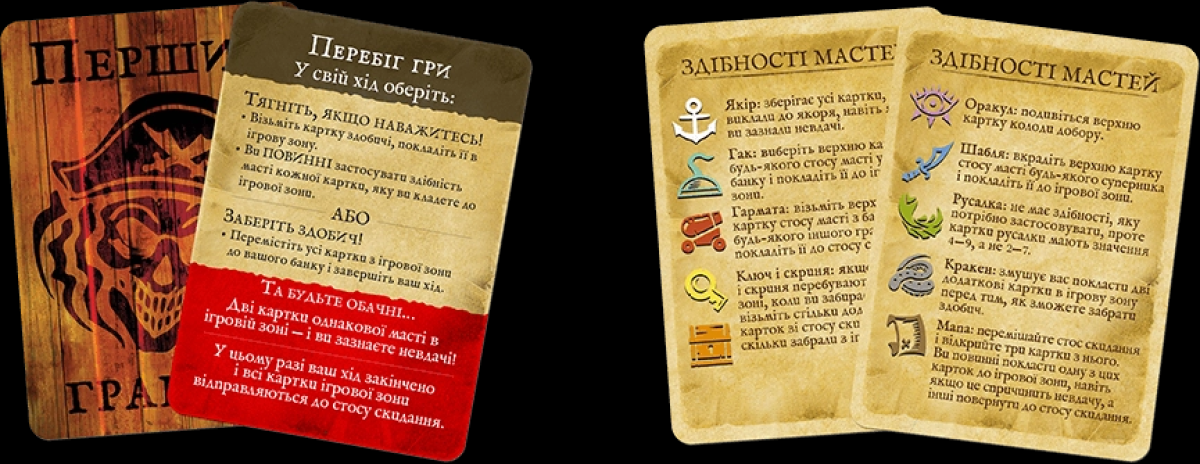 Полное издание на украинском языке содержит не только карты добычи, но и 17 карточек способностей пиратов и 6 вариантов игры для большей реиграбельности. Для варианта игры «Русалка» используются дополнительные карты.