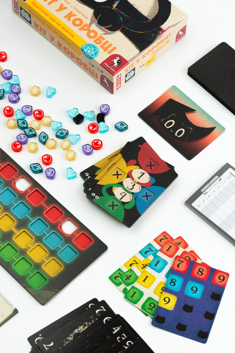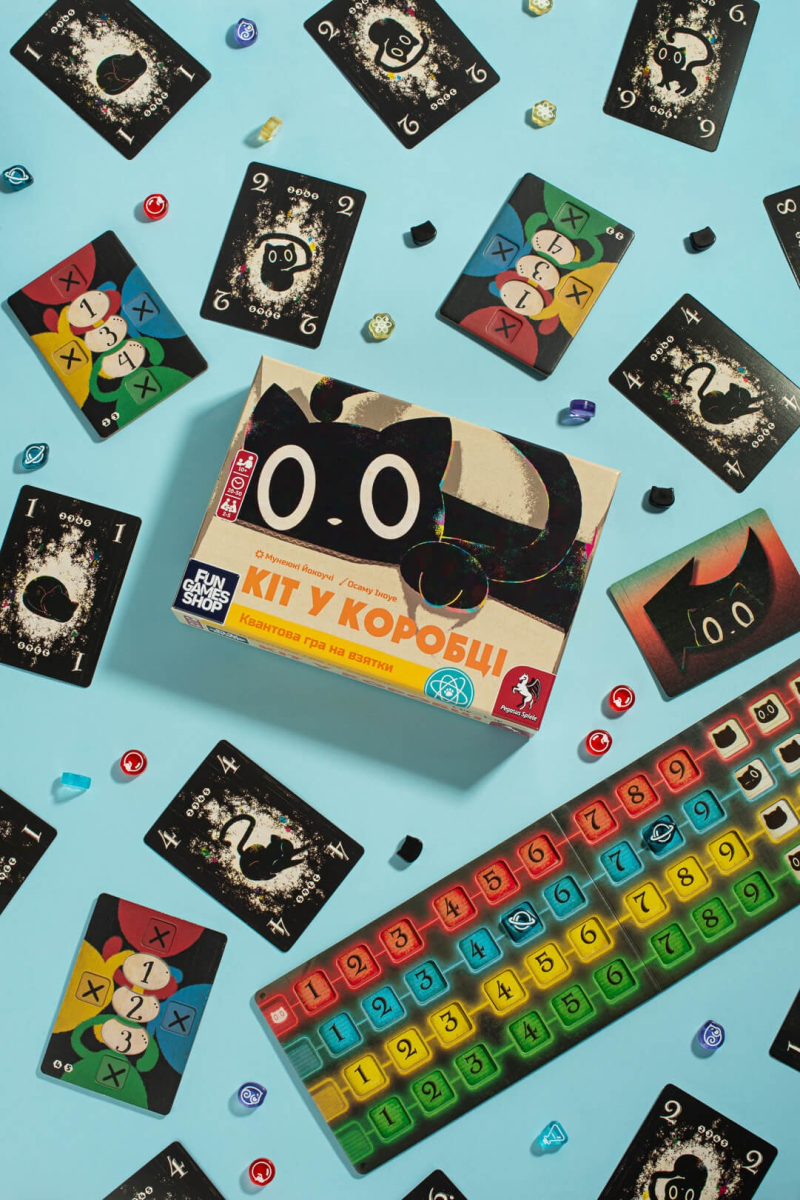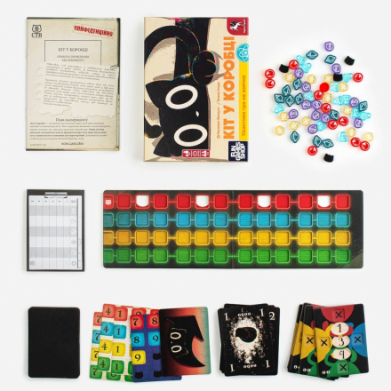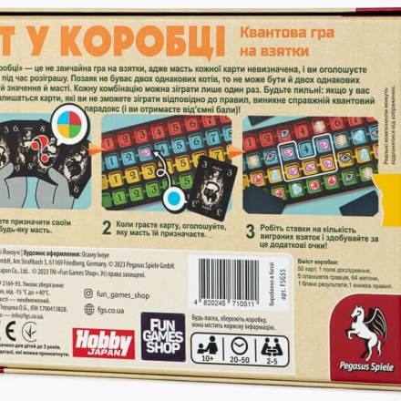 «Кот в коробке» – это квантовая игра на взятки. Как известно, нет двух совершенно одинаковых котиков, а значит, в игре не смогут участвовать карты, совпадающие одновременно по масти и значению. Почему котики квантовые? Все карты имеют значение, однако не имеют масти – вы будете назначать карте масть в момент разыгрывания!