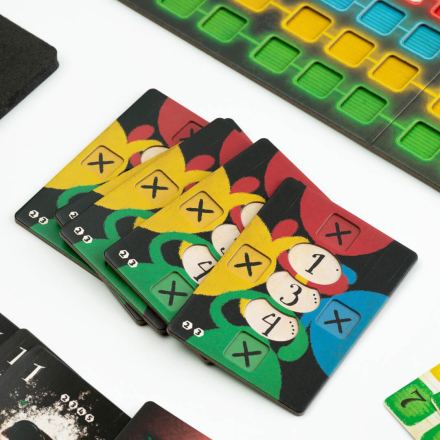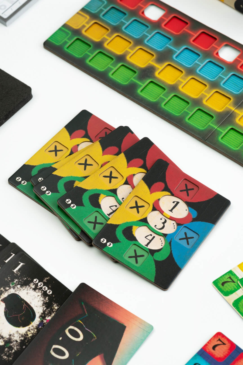 - После этого игрок кладет разыгранную карту возле своего планшета со стороны, соответствующей цвету масти, а также кладет жетон на ячейку соответствующих масти и значения на поле исследований. Одну ячейку может занимать только один жетон.
