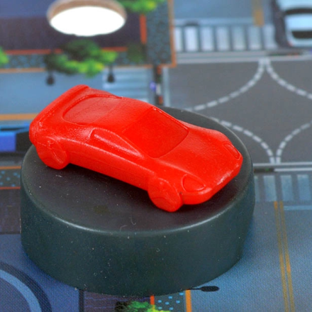 - Прячет машину под новым зданием, соседним ортогонально с предыдущим местом нахождения авто, вместе с жетоном следа текущего раунда.