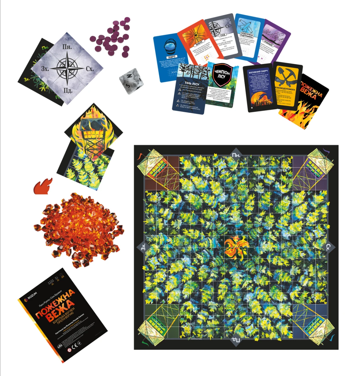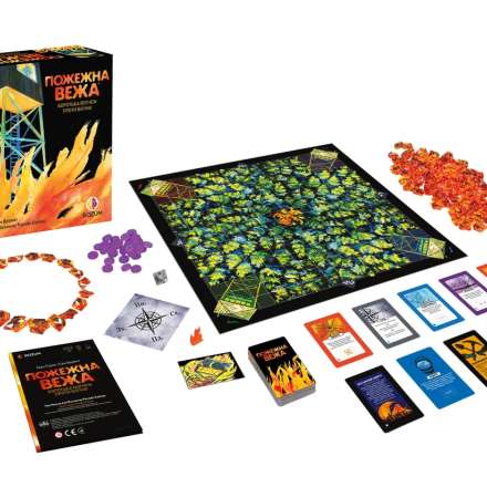 - Распространение пожара. Разместите жетон огня на свободной клетке поля по направлению ветра от Вечного огня в центре поля, или от любого другого имеющегося жетона огня.
