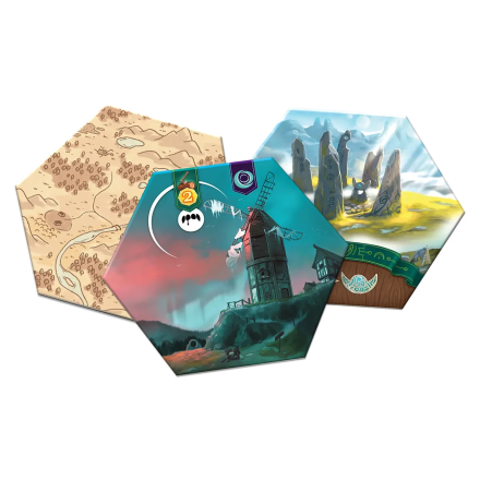 - Битва. Во время встречи на тайле с монстром (малым, большим или Зверем), герой может атаковать, бросив кубики. Количество кубиков монстра указано на его жетоне, а герой всегда бросает два зеленых кубика и несколько дополнительных в зависимости от своей амуниции или эликсиров. После битвы и получения повреждений можно отступить или выполнить еще до двух схваток. Если монстр был побежден – наградой могут быть монеты, новое снаряжение или улучшение снаряжения. Если здоровье героя опускается до 0 – он перемещается на тайл Замка и полностью восстанавливает здоровье, но теряет все монеты и 1 снаряжение по своему выбору.