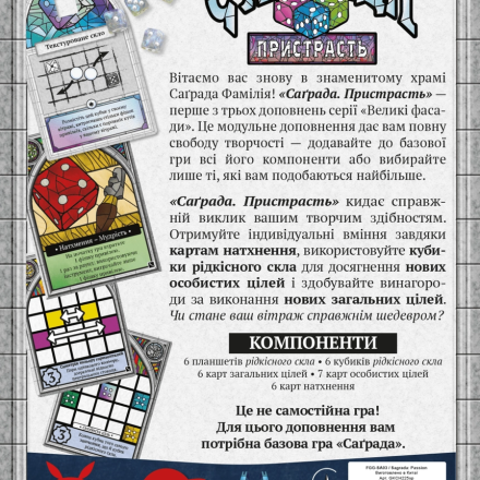 «Страсть» сделает базовую игру более вариативной, разнообразной и динамичной, предложит новые победные стратегии и возможности для достижения целей. Фанатам игры «Саграда» советуем также обратить внимание на дополнение «Жизнь».
