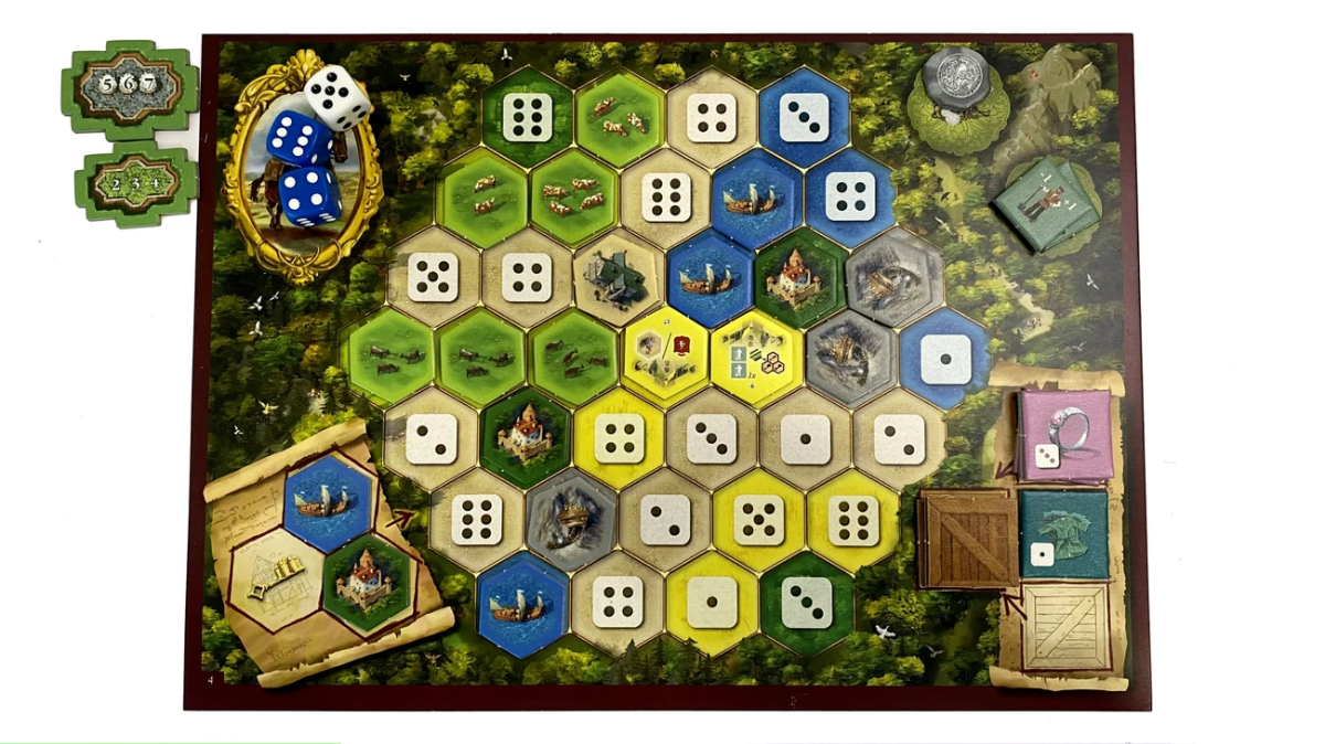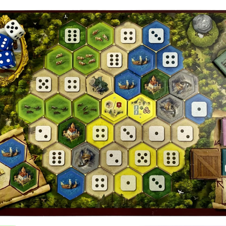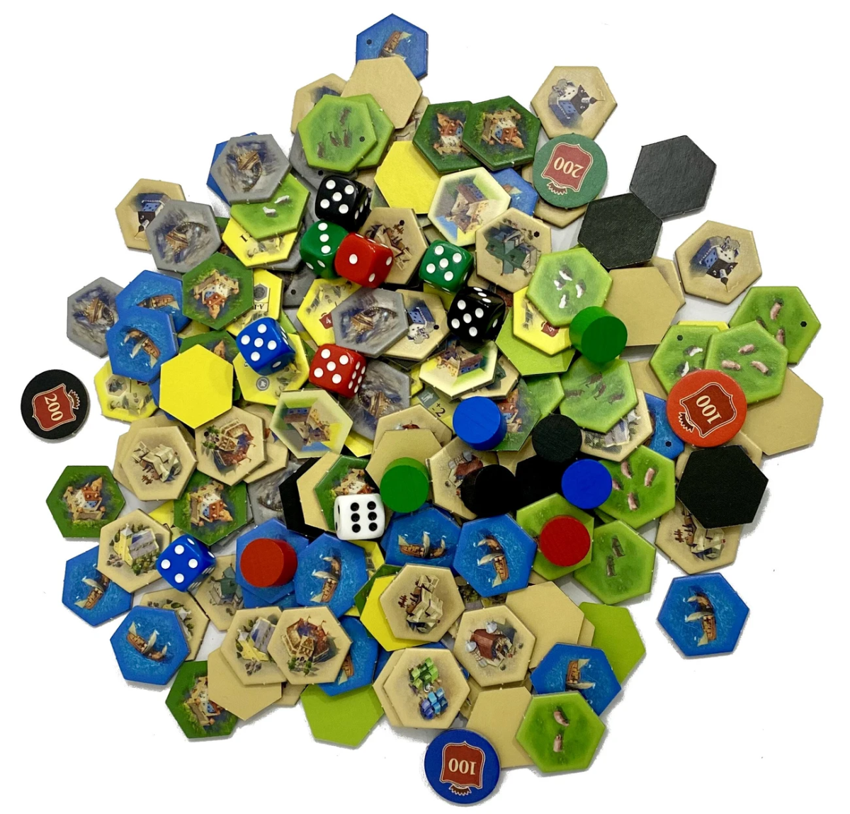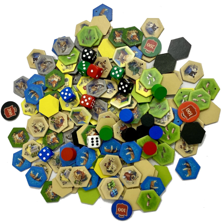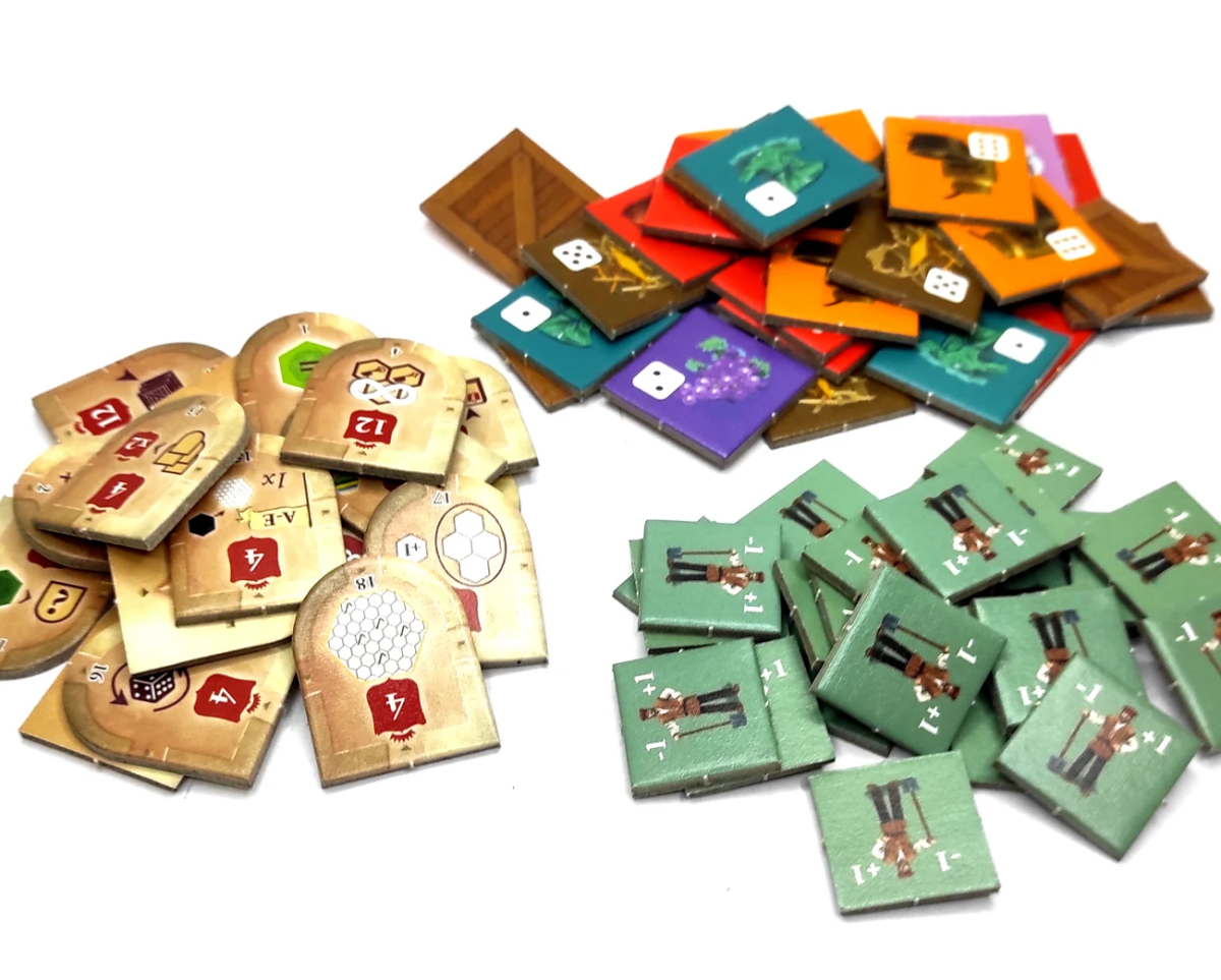 Синие тайлы кораблей позволяют забрать все товары из любого хранилища и продвинуться по шкале очередности хода. Животноводческие салатовые тайлы приносят столько победных очков, сколько животных изображено на них. Темно-зеленые замки дают дополнительное действие. Рудники приносят серебряные самородки. Бежевые жетоны зданий позволяют продавать товары, получать новые тайлы, самородки, рабочих и т.д. Желтые гексы знаний дают определенные бонусы в процессе партии и приносят победные очки в конце игры.