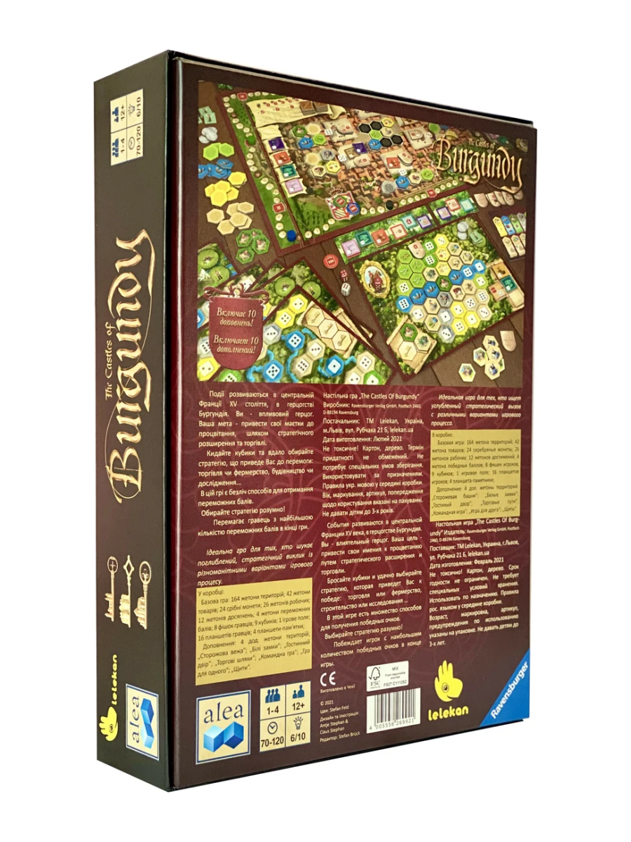 Украинская версия игры «The Castles of Burgundy (20th Anniversary)» - самое полное издание «Замков Бургундии»! Большая коробка содержит базовую игру с доработанными правилами, перерисованным полем и ресурсами, а также сразу 8 дополнений (7 выходили раньше, а 1 - совершенно новое). Помимо основных компонентов, игроки получат: