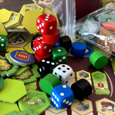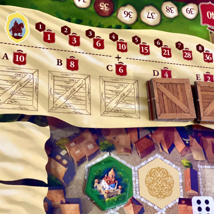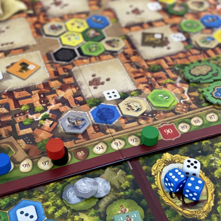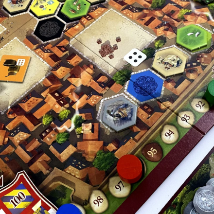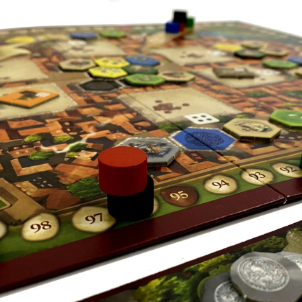 Когда игрок полностью заполняет зону планшета одного цвета, он получает победные очки. Один раз за раунд игрок может купить за два самородка тайл с черного рынка. С помощью жетонов рабочих можно изменять значения на кубиках.