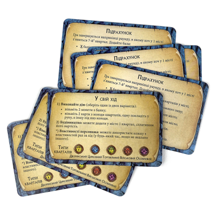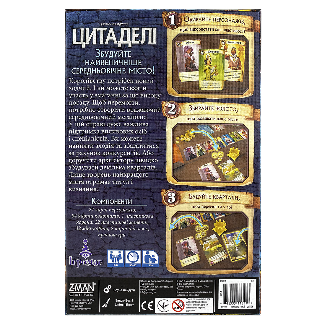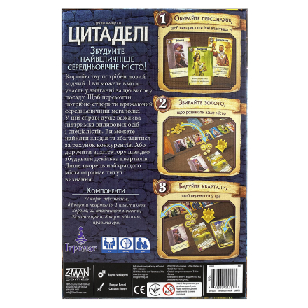Цитадели 2016 – это новое переиздание мегапопулярной настольной игры Цитадели, которая завоевала любовь игроков по всему миру. Благодаря увлекательному игровому процессу, азарту, хитрым уловкам, блефу и ярким эмоциям, Цитадели никогда не устаревают. В эту игру с удовольствием играют на вечеринках и днях рождения, на корпоративах и на отдыхе, дети и взрослые. И сейчас перед вами украинское издание этой шедевральной игры!