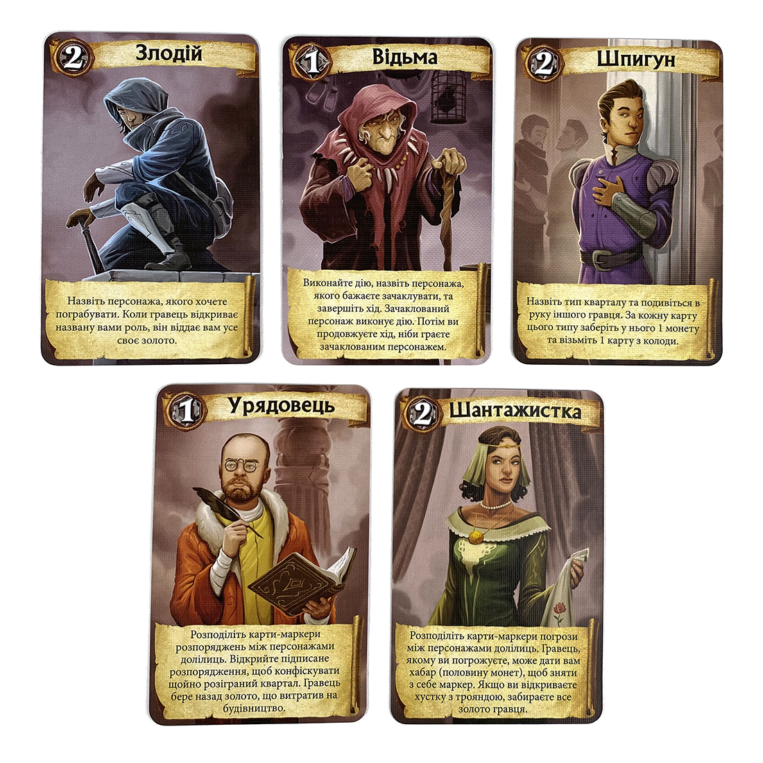 - Кулуарные Интриги: Ведьма, Шантажист, Чародейка, Император, Аббат, Алхимик, Архитектор, Военачальник, Таможенник.