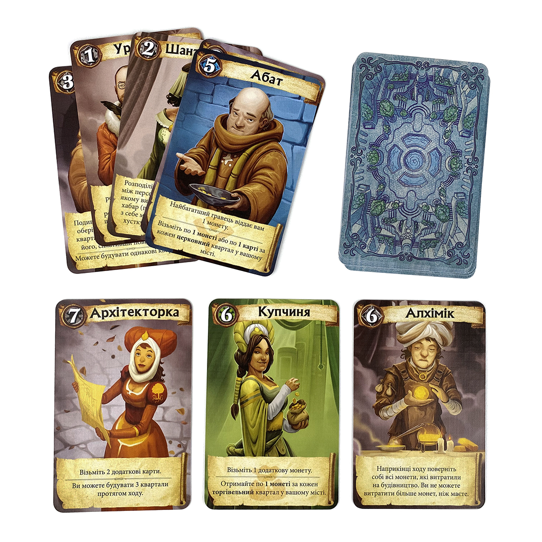Как видите, огромное количество персонажей и комбинаций их умений каждый раз предлагает вам уникальные партии с интересным и непредсказуемым исходом. Конечно же, вы можете создавать и свои комбинации персонажей, по своему вкусу, внося еще больше разнообразия в игру! Правила Цитадели (Citadels) практически не изменились. Игрокам, заручившись помощью влиятельных персон королевства, предстоит застраивать город храмами, дворцами, тавернами и прочими средневековыми строениями. Тот игрок, чей город будет самым дорогим и роскошным, победит в игре. Изюминка игры лежит в процессе выбора персонажей. Ведь в каждом раунде Вы можете выбрать того персонажа, чья способность вам нужна больше всего. Но будьте осторожны, ведь на вас может охотиться ассасин, а кошель с золотом украдет вор. Блефуйте! Блефуйте, хитрите, выбирайте тех персонажей, которые нужны вашим соперникам, ведь в этом и заключается прелесть игры.