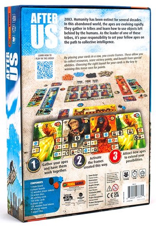 На планету Земля таки упала тень всеобъемлющей катастрофы. Человечество истреблено, но некоторые жители планеты все же продолжают развиваться. Счастливую жизнь еще возможно воссоздать! Сделайте это вместе с различными видами обезьян в игре «После нас»! Это колодостроительная карточная игра для 1-6 игроков на управление ресурсами. Узнали этот арт? Это же талантливый и мастеровитый Венсан Дютре — дизайнер таких игр как «Ольтре» та «Племена ветра». Поспешите! Будущее зависит от вас!