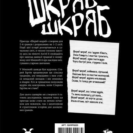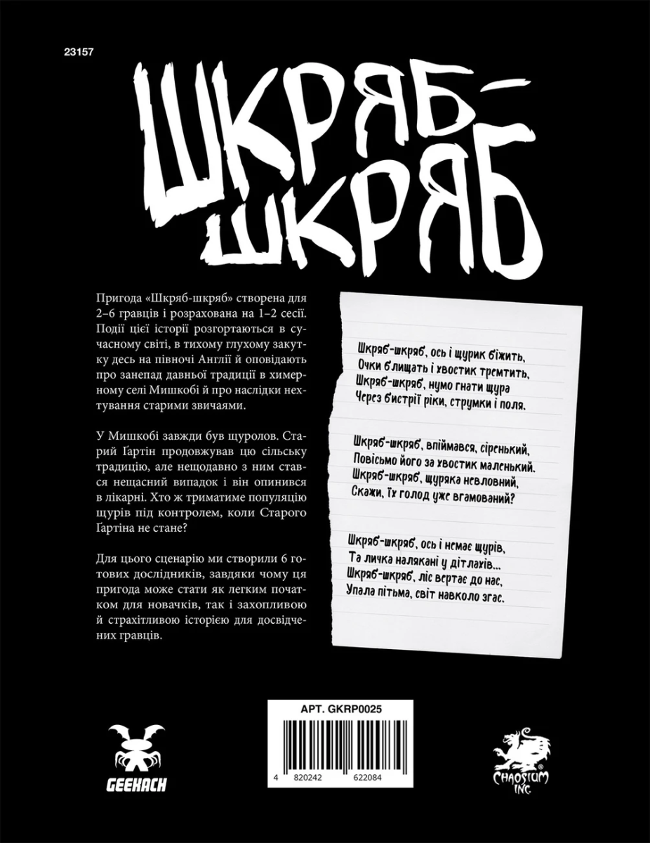 Какой ужас ожидает в мрачных лесах вокруг сонного английского селения? «Шкряб-шкряб» — это приключение для самой свежей — седьмой редакции настольной ролевой игры «Зов Ктулху». События истории разворачиваются в современном мире в тихом углу где-то на севере Англии.